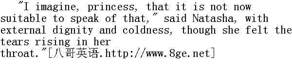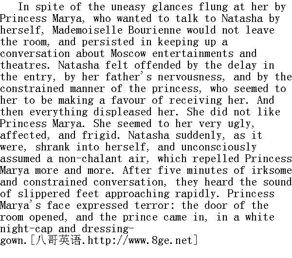尽管公爵小姐玛丽亚希望单独地跟娜塔莎谈谈话, 她一面用那焦虑不安的目光投射在布里安小姐身上, 但是布里安小姐还是没有从房里出来, 她不改变话题, 一个劲儿谈莫斯科的娱乐和剧院。娜塔莎的父亲在接待室里心慌意乱, 局促不安, 而且公爵小姐的腔调听来很不自然, 娜塔莎因而感到受了侮辱, 她觉得公爵小姐好像开恩似的接见了她。因此, 什么都不能使她悦意。她不喜欢公爵小姐玛丽亚。她仿佛觉得她很不好看, 既虚伪而冷淡。娜塔莎忽然精神萎靡不振, 说话时带着不太客气的腔调, 这就使得她和公爵小姐玛丽亚更疏远了。经过五分钟阴郁的虚伪的谈话之后可以听见飞快走来的步履声。公爵小姐玛丽亚的脸上现出惊恐的神色, 房门敞开了, 公爵戴着一顶白色的睡帽, 穿着一件长罩衫走进来了。 "Ah, madam," he began, "madam, countess....Countess Rostov... if I'm not mistaken...I beg you to excuse me, to excuse me...I didn't know, madam. As God's above, I didn't know that you were deigning to visit us, and came in to my daughter in this costume. I beg you to excuse me...as God's above, I didn't know," he repeated so unnaturally, with emphasis on the word "God," and so unpleasantly, that Princess Marya rose to her feet with her eyes on the ground, not daring to look either at her father or at Natasha. Natasha, getting up and curtseying, did not know either what she was to do. Only Mademoiselle Bourienne smiled agreeably." 啊, 小姐, "他开口说, "小姐, 伯爵小姐, ......伯爵小姐罗斯托娃, 如果我没有搞错的话......请您原谅, 请原谅......伯爵小姐, 我不知道。上帝明鉴, 我不知道您光临寒舍, 我穿这样的衣裳来看女儿了, 请原谅......上帝明鉴, 我不知道。"他很不自然地重说一遍, 强调"上帝"这个词, 那样令人不痛快, 以致公爵小姐玛丽亚垂下眼帘站在那儿, 既不敢瞧瞧父亲, 也不敢瞧瞧娜塔莎。娜塔莎站起来, 行屈膝礼, 她也不晓得应该怎么办。唯独布里安小姐面露愉快的微笑。 "I beg you to excuse me, I beg you to excuse me! As God's above, I didn't know," muttered the old man, and looking Natasha over from head to foot, he went out.Mademoiselle Bourienne was the first to recover herself after this apparition, and began talking about the prince's ill-health. Natasha and Princess Marya gazed dumbly at one another, and the longer they gazed dumbly at one another without saying what they wanted to say, the more unfavourably each felt disposed to the other." 请您原谅, 请原谅!上帝明鉴, 我不知道, "老头儿嘟嘟哝哝地说, 他从头到脚把娜塔莎打量了一番, 然后走出去了。在发生这种情况后, 布里安小姐头一个想到了应对的办法, 她开始说到公爵的身体欠佳。娜塔莎和公爵小姐玛丽亚沉默无言地面面相觑, 她们沉默无言地面面相觑得越久, 不说出她们应该说的话, 她们就越发不怀好意地互相猜度。 When the count returned, Natasha showed a discourteous relief at seeing him, and made haste to get away. At that moment she almost hated that stiff, oldish princess, who could put her in such an awkward position, and spend half an hour with her without saying a word about Prince Andrey. "I couldn't be the first to speak of him before that Frenchwoman," thought Natasha. Princess Marya meanwhile was tortured by the very same feeling. She knew what she had to say to Natasha, but she could not do it, both because Mademoiselle Bourienne prevented her, and because she did not know herself why-it was difficult for her to begin to speak of the marriage. The count was already going out of the room when Princess Marya moved rapidly up to Natasha, took her hand, and, with a heavy sigh, said: "Wait a moment, I want..." Natasha's expression as she looked at Princess Marya was ironical, though she did not know why. 当伯爵回来以后, 娜塔莎在他面前无礼貌地高兴起来, 急急忙忙地离开;这时她几乎仇视那个年岁大的、干巴巴的公爵小姐, 她会把她弄得狼狈不堪, 关于安德烈公爵, 她一言不发, 和她在一块就这样待上半个钟头了, "要知道, 我不会在这个法国女人面前首先谈到他。"娜塔莎想道。与此同时, 公爵小姐玛丽亚也为这件事觉得难受。她知道她应该向娜塔莎说些什么话, 但是她不能这样做, 因为布里安小姐妨碍她, 因为她自己也不知道, 她为什么谈起这桩婚事时心里就那么难受。当伯爵从房里走出去, 公爵小姐玛丽亚便迈开疾速的脚步, 走到娜塔莎跟前, 握住她的一双手, 沉重地叹一口气说: "等一等, 我要......"娜塔莎连她自己也不知道在讥笑什么, 她讥笑地瞧着公爵小姐玛丽亚。 "Dear Natalie," said Princess Marya, "do believe how glad I am that my brother has found such happiness..." She paused, feeling she was telling a lie. Natasha noticed the pause, and guessed the reason of it." 可爱的娜塔莉, "公爵小姐玛丽亚说: "您可知道, 我哥哥找到了幸福, 我感到高兴......"她停下来了, 觉得她在说谎话。娜塔莎发现她停顿一下, 猜中了她稍事停顿的原因。