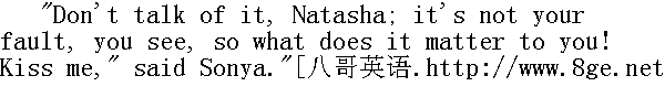 我想, 公爵小姐, 现在说这件事很不方便。"娜塔莎说, 她表面上尊严而且冷淡, 但是她觉得眼泪已涌向喉头。 "What have I said, what have I done?" she thought as soon as she had gone out of the room." 我说了什么, 我做了什么!"她刚走出房门, 就这么想。 They had to wait a long while for Natasha to come to dinner that day. She was sitting in her room, crying like a child, choking, and sobbing. Sonya stood over her, and kept kissing her on the head. 这天他们等候娜塔莎出来吃午饭, 等了很久。她坐在自己房里, 像孩儿一样嚎啕大哭, 她一面擤鼻涕, 一面呜咽。索尼娅站在她身旁, 吻她的头发。 "Natasha, what is it?" she kept saying. "Why need you mind about them? It will pass, Natasha."" 娜塔莎, 你哭什么?"她说。"你与他们何干?娜塔莎, 什么都会过去的。......" "No, if only you knew how insulting it was...as though I..."" 不, 若是你知道, 这多么令人气恼......正像我这样......"
