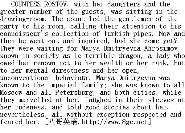 叫做罗斯托娃的伯爵夫人随同几个女儿陪伴着许多客人坐在客厅里。伯爵把几位男客带进书斋去, 让他们玩赏他所搜集的土耳其烟斗。他有时候走出来, 问问大家: "她来了没有?"大伙儿正在等候玛丽亚?德米特里耶夫娜?阿赫罗西莫娃--上流社会中绰号叫做leterribledragon①的夫人, 她之所以大名鼎鼎, 并不是由于财富或荣耀地位, 而是由于心地正直, 待人朴实的缘故。皇室知道玛丽亚?德米特里耶夫娜, 整个莫斯科和整个彼得堡都知道她。她使这两个城市的人感到惊奇, 他们悄悄地讥笑她的粗暴, 谈论她的趣闻。但是人人都一无例外地尊敬她, 而且畏惧她。 ①法语: 恐龙。 In the count's room, full of smoke, there was talk of the war, which had been declared in a manifesto, and of the levies of troops. The manifesto no one had yet read, but every one knew of its appearance. The count was sitting on an ottoman with a man smoking and talking on each side of him. The count himself was neither smoking nor talking, but, with his head cocked first on one side and then on the other, gazed with evident satisfaction at the smokers, and listened to the argument he had got up between his two neighbours. 书斋里烟雾弥漫, 大家正在谈论文告中业已宣布的战争和征兵事宜。谁也还没有读到上谕, 但是人人都知道业已颁布了。那伯爵坐在一面抽烟, 一面交谈的两位邻近的客人之间的土耳其式沙发上。伯爵自己不抽烟, 也不开口说话, 可是他时而把头侧向这边, 时而侧向那边, 显然他在留意地观看这两位抽烟的客人, 静听被他惹起的两位邻座的讧争。 One of these two was a civilian with a thin, wrinkled, bilious, close-shaven face, a man past middle age, though dressed like the most fashionable young man. He sat with his leg up on the ottoman, as though he were at home, and with the amber mouthpiece in the side of his mouth, he smoked spasmodically, puckering up his face. This was an old bachelor, Shinshin, a cousin of the countess's, famed in Moscow drawing-rooms for his biting wit. He seemed supercilious in his manner to his companion, a fresh, rosy officer of the Guards, irreproachably washed and brushed and buttoned. He held his pipe in the middle of his mouth, and drawing in a little smoke, sent it coiling in rings out of his fine red lips. He was Lieutenant Berg, an officer in the Semenovsky regiment with whom Boris was to go away, and about whom Natasha had taunted Vera, calling Berg her suitor. The count sat between these two listening intently to them. The count's favourite entertainment, next to playing boston, of which he was very fond, was that of listening to conversation, especially when he had succeeded in getting up a dispute between two talkative friends. 交谈者之中一人是文官, 那布满皱纹、瘦削的面部刮得很光, 带着易动肝火的神态, 他已经趋近老年, 但穿着像个挺时髦的年轻人。他盘着两腿坐在土耳其式沙发上, 那模样跟户主家里人不相上下, 他的嘴角上深深地叼着一根琥珀烟嘴子, 一面眯缝起眼睛, 若断若续地抽烟。这位客人是老光棍, 伯爵夫人的堂兄, 莫斯科的沙龙中常常议论他, 都说他是个造谣中伤的人。他对交谈者, 似乎会装作屈尊俯就的样子。另一位客人长着一张白里透红的面孔, 精神焕发, 是个近卫军军官, 他梳洗得整齐清洁, 扣上了衣扣, 嘴中叼着一根琥珀烟嘴子, 用那粉红的嘴唇轻轻地吸烟, 从美丽的嘴中吐出一个个烟圈来。他就是谢苗诺夫兵团的军官贝格中尉, 鲍里斯和他一起在这个兵团入伍。娜塔莎逗弄过薇拉--伯爵夫人的长女, 将贝格称为她的未婚夫。伯爵坐在他们之间, 全神贯注地听着。除开他所酷爱的波士顿牌戏之外, 倾听大家争论, 是一件使他至为愉快的事, 尤其是当他在两个喜爱聊天的人中间引起争论的时候, 他就觉得更加高兴了。 "Come, how is it, mon tres honorable Alphonse Karlitch," said Shinshin, chuckling, and using a combination of the most popular Russian colloquialisms and the most recherches French expressions, which constituted the peculiarity of his phraseology. "You reckon you'll get an income from the government, and you want to get a little something from your company too?" " 老兄, 怎么啦, montreshonoraole①阿尔万斯?卡尔雷奇, "申申说道, 微微一笑, 他把民间最通俗的俄文语句和优雅的法文句子混杂在一起, 这也就是他说话的特点, "Vouscomptezvousfairedesrentessurl'etat②, 您想获得连队的一笔收入吗?" ②法语: 您想获得政府的一笔收入。 "No, Pyotr Nikolaitch, I only want to show that in the cavalry the advantages are few as compared with the infantry. Consider my position now, for instance, Pyotr Nikolaitch." Berg talked very precisely, serenely, and politely. All he said was always concerning himself. He always maintained a serene silence when any subject was discussed that had no direct bearing on himself. And he could be silent in that way for several hours at a time, neither experiencing nor causing in others the slightest embarrassment. But as soon as the conversation concerned him personally, he began to talk at length and with visible satisfaction. " 彼得?尼古拉耶维奇, 不是这么回事, 我只是想表白一下, 骑兵服役的收益比步兵服役要少得多, 彼得?尼古拉耶维奇, 请您设想一下我现在的处境吧。"贝格说起话来总是十分准确、心平气和, 态度很谦恭, 他的谈话向来只是关系到他个人的私事, 每当他人谈论的事情和他没有直接关系时, 他便沉默不言。他能这样接连几个小时默不作声, 一点也不觉得忸怩不安, 而且不让他人产生这种感觉。可是交谈一提到他本人, 他就长篇大论地说起来, 明显地露