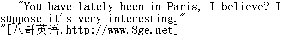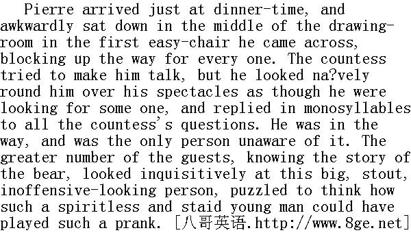 皮埃尔在临近午宴时来到了, 他在客厅当中随便碰到的一把安乐椅上不好意思地坐着, 拦住大家的络。伯爵夫人想要他说话, 但是他戴着眼镜稚气地向四周张望, 好像在寻找某人似的, 他简短地回答伯爵夫人提出的各种问题。他的样子羞羞涩涩, 只有他一人觉察不出来。大部分客人都晓得他耍狗熊闹出的丑闻, 因此都出于好奇心看看这个长得高大的胖乎乎的忠厚人, 心里都疑惑这个谦虚的笨伯怎么会戏弄警察分局局长呢。 "You have only lately arrived?" the countess asked him. " 您是不久以前回国的吗?"伯爵夫人问他。 "Oui, madame." "Oui, madame "①他向四面打量, 答道。 "You have not seen my husband?" " 您没有看见我丈夫吗?" "Non, madame." He smiled very inappropriately. "Non, madame "②他不适时地微微一笑。