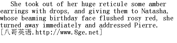 她从女式大手提包里取出一双梨形蓝宝石耳环, 送给两颊粉红、喜气洋洋的过命名日的娜塔莎, 之后立即转过脸去避开她, 对皮埃尔说话。 "Ay, ay! come here, sir!" she said in an intentionally quiet and gentle voice. "Come here, sir ..." And she tucked her sleeve up higher in an ominous manner. " 嗨, 嗨, 亲爱的!到这里来, "她用假装的尖声细语说道, "亲爱的, 来吧......"她现出威吓的样子把衣袖卷得更高了。 Pierre went up, looking innocently at her over his spectacles. 皮埃尔走到面前来了, 他透过眼镜稚气地望着她。 "Come along, come along, sir! I was the only person that told your father the truth when he was in high favour, and in your case it is a sacred duty." She paused. Every one was mutely expectant of what was to follow, feeling that this was merely a prelude. "A pretty fellow, there's no denying! a pretty fellow! ... His father is lying on his deathbed, and he's amusing himself, setting a police-constable astride on a bear! For shame, sir, for shame! You had better have gone to the war." " 亲爱的, 到我跟前来, 到我跟前来!当你父亲有权有势的时候, 只有我这个人才对他说真心话, 对于你呢, 我听凭上帝的吩咐, 也这样做就是。"她沉默一会儿, 大家都不开腔, 等待着就要发生什么事, 都觉得这只是一个开场白而已。"这孩子好嘛, 没有什么话可说!这孩子好嘛!......他父亲躺在病榻上, 他却寻欢作乐, 竟然把警察分局局长捆在狗熊背上。我的天, 真不要脸, 真不要脸!去打仗好了。" She turned away and gave her hand to the count, who could hardly keep from laughing. 她把脸转了过去, 向伯爵伸出一只手来, 伯爵险些儿忍不住要笑出声来。