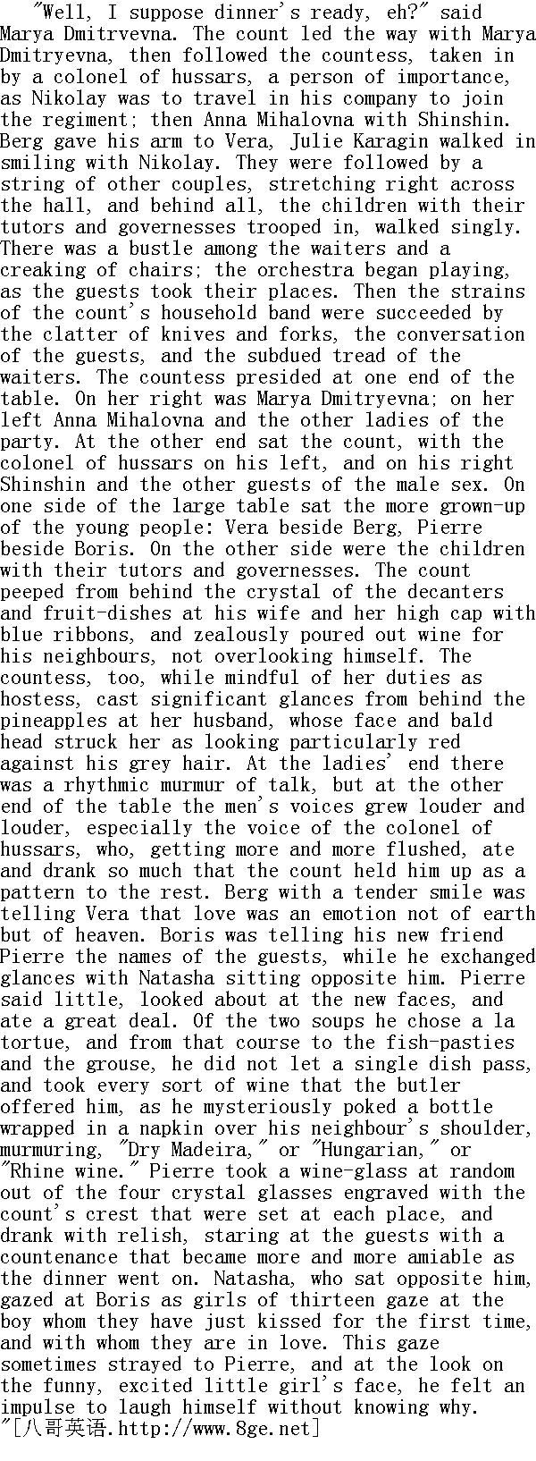 好吧, 我看差不多要就座了吧?"玛丽亚?德米特里耶夫娜说道。伯爵和玛丽亚?德米特里耶夫娜启程前行, 骠骑兵上校领着伯爵夫人尾随其后, 上校是个合乎时代需要的能人, 他要和尼古拉一道去追赶已经开拔的团队。安娜?米哈伊洛夫娜和申申搓成一对了。贝格向薇拉伸出手来, 做出亲热的姿态。笑容可掬的朱莉?卡拉金娜和尼古拉一同走向餐桌, 准备入座。其他一些成对的男女跟随在他们后面。沿着大厅鱼贯而行。儿童和男女家庭教师不结成一对, 作为殿后。堂倌都忙碌起来, 椅子碰撞得轧轧作响, 乐队奏起合唱曲, 客人入席就座了。刀叉的铿锵声、客人的说话声、堂倌轻盈的步履声替代了伯爵家庭乐队的奏鸣声。伯爵夫人坐在餐桌一端的首席上。玛丽亚?德米特里耶夫娜坐在右边, 安娜?米哈伊洛夫娜和其他女客坐在左边。伯爵坐在餐桌的另一端, 骠骑兵上校坐在左边, 申申和其他男客坐在右边。年纪较大的年轻人坐在长餐桌的一旁;薇拉和贝格并排而坐, 皮埃尔和鲍里斯并排而坐;儿童和男女家庭教师坐在另一旁。伯爵从水晶玻璃器皿、酒瓶和水果盘后不时地望望妻子和她那系着蓝色绸带的高高翘起的寝帽, 亲热地给邻座斟酒, 但也没有把自己忘记。伯爵夫人并没有忘记她这个主妇应尽的责任, 也向她丈夫投以意味深长的目光, 她似乎觉得丈夫的秃头和面庞在苍苍白发的强烈对照下, 显得红透了。在妇女就座的餐桌一端, 传来均匀的嘟哝声, 在男人就坐的另一端, 说话声越来越响亮, 尤其是那个骠骑兵上校的嗓音如雷贯耳, 他吃得多, 喝得多, 脸红得越来越厉害, 伯爵把他看作客人的模范。贝格面露温和的微笑, 正和薇拉谈到, 爱情并非是世俗的感情, 而是纯洁的感情。鲍里斯向他自己的新相识说出餐桌上客人的姓名, 并和坐在对面的娜塔莎互使眼色。皮埃尔寡于言谈, 不时地瞧瞧陌生的面孔, 他吃得太多了。从那两道汤中他所挑选的alatortue①和大馅饼, 直到花尾榛鸡, 他何尝放过一道菜。当那管家从邻座肩后悄悄地端出一只裹着餐巾的酒瓶, 一边说: "纯马德拉葡萄酒", "匈牙利葡萄酒", 或"莱茵葡萄酒"时, 他何尝放过一种葡萄酒。每份餐具前面放着四只刻有伯爵姓名花字的酒樽, 皮埃尔随便拿起一只酒樽, 高高兴兴地喝酒, 一面露出愈益快活的神态打量着客人。娜塔莎坐在对面, 她正盯着鲍里斯, 就像十三岁的姑娘两眼盯着头次接了吻的她所热恋的男孩那样。有时候她把同样的目光投在皮埃尔身上, 但不知为什么, 他在这个可笑的活泼的姑娘的目光逼视下真想笑出声来。 ①法语: 甲鱼汤。 Nikolay was sitting a long way from Sonya, beside Julie Karagin, and again smiling the same unconscious smile, he was talking to her. Sonya wore a company smile, but she was visibly in agonies of jealousy; at one moment she turned pale, then she crimsoned, and all her energies were concentrated on listening to what Nikolay and Julie were saying. The governess looked nervously about her, as though preparing to resent any slight that might be offered to the children. The German tutor was trying to learn by heart a list of all the kinds of dishes, desserts, and wines, in order to write a detailed description of them to the folks at home in Germany, and was greatly mortified that the butler with the bottle in the napkin had passed him over. The German knitted his brows, and tried to look as though he would not have cared to take that wine, but he was mortified because no one would understand that he had not wanted the wine to quench his thirst, or through greed, but from a conscientious desire for knowledge. 尼古拉在朱莉?卡拉金娜身旁坐着, 离索尼娅很远。他又面露情不自禁的微笑和她说些什么话。索尼娅含着微笑, 摆出很大的架子, 但显而易见, 她深受醋意的折磨, 脸上时而发白, 时而发红, 聚精会神地谛听尼古拉和朱莉之间的谈话。一位家庭女教师心神不安地环顾四周, 仿佛倘若有人想要凌辱儿童, 她就要给予反击似的。一名德国男家庭教师极力记住种种肴馔, 甜点心以及葡萄酒, 以便在寄往德国的家信中把这全部情形详尽地描述一下。当那管家拿着裹有餐巾的酒瓶给大家斟酒时, 竟把他漏掉了, 他简直气忿极了。他愁眉苦脸, 力图表示他不想饮这种葡萄酒。他所以恼火, 是因为谁也不了解, 他喝酒不是解渴, 也不是贪婪, 而是由于一种真诚的求知欲所致。