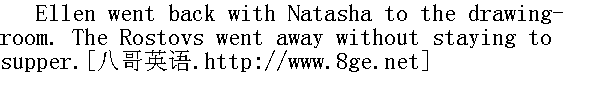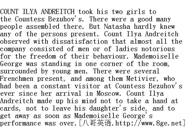 伊利亚·安德烈伊奇伯爵把他两个姑娘送到伯爵夫人别祖霍娃那里去了。相当多的人出席了晚会。然而娜塔莎几乎不认识所有到会的人。伊利亚·安德烈伊奇伯爵不满地发觉, 所有这些出席晚会的人多半是以自由散漫而出名的男人和女士。一群青年人把乔治小姐围在中间, 她站在客厅的角落里。几个法国人也出席晚会, 其中一人自从海伦抵达此地后成为海伦的家里人。伊利亚·安德烈伊奇伯爵决定不打纸牌, 不离开女儿们身边, 一当乔治表演完毕就回家去。 Anatole was at the door, unmistakably on the look-out for the Rostovs. At once greeting the count, he went up to Natasha and followed her in. As soon as Natasha saw him, the same feeling came upon her as at the theatre-the feeling of gratified vanity at his admiration of her, and terror at the absence of any moral barrier between them. 阿纳托利显然是在门旁等罗斯托夫家里人进来。伯爵一走来, 他立刻向伯爵问好, 然后走到娜塔莎面前, 跟在她后面。就像在戏院中那样, 娜塔莎刚刚望见他, 她就被那种徒慕虚荣的快感--因为他喜欢她而产生的一种虚荣心--控制住了, 又因为她与他之间没有道德上的隔阂, 所以她心中产生了一种恐惧感。 Ellen gave Natasha a delighted welcome, and was loud in her admiration of her loveliness and her dress. Soon after their arrival, Mademoiselle George went out of the room to change her dress. In the drawing-room chairs were being set in rows and people began to sit down. Anatole moved a chair for Natasha, and would have sat down by her, but the count, who was keeping his eye on Natasha, took the seat beside her. Anatole sat down behind. 海伦愉快地接待娜塔莎, 大声地夸奖她的美丽的容貌和装束。他们抵达后不久乔治小姐就从房里走出来, 穿上衣裳。他们在客厅里摆好椅子, 坐下来了。阿纳托利把椅子向娜塔莎那边挪一挪, 想坐在旁边, 但是伯爵目不转睛地望着娜塔莎, 在她身旁坐下来。阿纳托利坐在他们后面。 Mademoiselle George, with bare, fat, dimpled arms, and a red scarf flung over one shoulder, came into the empty space left for her between the chairs and threw herself into an unnatural pose. An enthusiastic whisper was audible. 乔治小姐裸露着两只粗大的有小窝窝的胳膊, 一边肩膀上披着一条红色的披巾, 走到安乐椅之间给她腾出来的地方, 她停下来, 姿势不自然。可以听见兴高采烈的低语声。 Mademoiselle George scanned her audience with stern and gloomy eyes, and began reciting French verses, describing her guilty love for her son. In places she raised her voice, in places she dropped to a whisper solemnly lifting her head; in places she broke off and hissed with rolling eyes. 乔治小姐严肃而阴郁地环视了一下观众, 她开始用法语朗诵一首诗, 这首诗中讲的是她对她儿子的非法的爱情。朗诵到某个地方她提高嗓音, 朗诵到某个地方她庄重地昂起头来, 低声细语, 在某个地方停顿一下, 瞪大着眼睛发出嘶哑的声音。