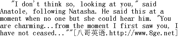 当我望您时, 我不认为她更美丽。"阿纳多利跟在娜塔莎后面说。当她一个人能够听见话音的时候, 他才说了这句话。"您非常可爱......自从我看见您, 我始终......" "Come along, come along, Natasha!" said the count, turning back for his daughter. "How pretty she is!"" 娜塔莎, 咱们走吧, 咱们走吧, "伯爵走回来叫女儿, "她非常漂亮!" Natasha saying nothing went up to her father, and gazed at him with eyes of inquiring wonder. 娜塔莎不说一句话, 走到父亲跟前, 用疑惑得出奇的目光望着他。 After several recitations in different styles, Mademoiselle George went away, and Countess Bezuhov invited all the company to the great hall. 乔治小姐朗诵了几次后, 便走了, 伯爵夫人别祖霍娃请大伙儿到大厅里去。 The count would have taken leave, but Ellen besought him not to spoil her improvised ball. The Rostovs stayed on. Anatole asked Natasha for a waltz, and during the waltz, squeezing her waist and her hand, he told her she was bewitching and that he loved her. During the ecossaise, which she danced again with Kuragin, when they were left alone Anatole said nothing to her, he simply looked at her. Natasha was in doubt whether she had not dreamed what he said to her during the waltz. At the end of the first figure he pressed her hand again. Natasha lifted her frightened eyes to his face, but there was an expression of such assurance and warmth in his fond look and smile that she could not as she looked at him say what she had to say to him. She dropped her eyes. 伯爵想走了, 但是海伦央求他不要搞垮她的即兴舞会。罗斯托夫家里的人留了下来。阿纳多利请娜塔莎跳华尔兹舞, 在跳华尔兹舞的时候, 他紧紧握着她的腰身和臂膀并且对她说, 她ravissante①, 他很爱她。当她又和库拉金同跳苏格兰民间舞时, 当他们二人单独待在一起时, 阿纳多利一言不发, 只是眼巴巴地望着她。娜塔莎感到疑惑, 她是否还在做梦, 梦见在跳华尔兹舞时他对她说了什么话。在跳完第一轮时, 他又握住她的手。娜塔莎向他抬起恐惧的眼睛, 他的和蔼的眼神和微笑中含有如此自信和温柔的表情, 以致在她凝视他时她不能说出她应该向他说的话。她垂下眼帘。 "Don't say such things to me. I am betrothed, and I love another man ..." she articulated rapidly. She glanced at him. Anatole was neither disconcerted nor mortified at what she had said." 您不要向我说这种事情, 我已经订婚, 我爱着另外一个人。"她急促地说......她朝他瞥了一眼。阿纳托利没有腼腆起来, 他对她所说的话不感到难过。 "Don't talk to me of that. What is that to me," he said; "I tell you I am mad, mad with love of you. Is it my fault that you are fascinating?...It's for us to begin."" 您不要向我提到这件事。这与我何干?"他说。"我要说, 我爱上您了, 爱得发狂, 发狂。您招人喜欢, 难道归罪于我吗?......我们要开始跳了。" Natasha, eager and agitated, looked about her with wide-open, frightened eyes, and seemed to be enjoying herself more than usual. She scarcely grasped anything that happened that evening. They danced the ecossaise and "Grandfather." Her father suggested their going, and she begged to stay longer. Wherever she was, and with whomsoever she was speaking, she felt his eyes upon her. Then she remembered that she had asked her father's permission to go into a dressing-room to rearrange her dress, that Ellen had followed her, had talked to her, laughing, of her brother's passion, and that in the little divan-room she had been met again by Anatole; that Ellen had somehow vanished, they were left alone, and Anatole taking her by the hand, had said in a tender voice: 娜塔莎兴奋起来, 心里又忐忑不安, 瞪大了惊恐的眼睛, 环顾四周, 她仿佛觉得比平日更加快活。她几乎一点也不了解这天夜里出了什么事。他们跳了苏格兰民间舞和格罗斯法特舞, 父亲就请她离开舞厅, 她请求父亲让她留下来。无论她在那里, 无论她和谁说话, 她都觉察到他投射在她身上的目光。然后她想到, 她请她家父允许她去更衣室整理一下连衣裙, 海伦跟在她身后, 一边发笑, 一边向她谈到他哥哥的爱情, 之后在一间摆着沙发的休息室里又遇见阿纳托利, 海伦溜到什么地方去了, 于是他们俩个人留在那里, 阿纳托利紧握她的手, 用那温柔的嗓音说: "I can't come to see you, but is it possible that I shall never see you? I love you madly. Can I never ...?" and barring her way he brought his face close to hers." 我不能到您那儿去, 但是我难道永远看不到您么?我爱您爱得发狂了, 难道永远也不能?......"于是他拦住路口, 把他的脸凑近她的脸。
