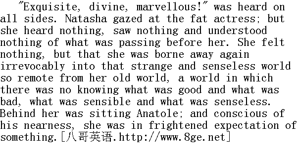 "Adorable, divin, delicieux!" ①可以听见四面八方的喊声。娜塔莎瞧着胖乎乎的乔治, 可是什么也听不见, 看不见, 面前发生的事她全不明白, 她只觉得她自己无可挽回地远离过去的世界, 完全沉浸在令人可怕的疯狂的世界, 在这个世界她没法知道什么是善, 什么是丑, 什么是理性, 什么是狂妄。阿纳托利坐在她后面, 她觉得他离她太近, 因此惊惶失措地等待着什么。 ①法语: 令人陶醉神妙, 美不胜言! After the first monologue all the company rose and surrounded Mademoiselle George, expressing their admiration. 在初次独白之后, 所有的人都站起来, 围住了乔治小姐, 向她表示自己喜悦的心情。 "How handsome she is!" said Natasha to her father, as he got up with the rest and moved through the crowd to the actress." 她多么漂亮!"娜塔莎对父亲说, 她和其他人一同站起来, 穿过一群人向女伶身边走去。