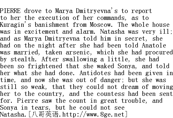 皮埃尔启程前往玛丽亚·德米特里耶夫娜家, 通知她说, 库拉金已被逐出莫斯科, 她的心愿已经实现了。全家人惊皇失措, 焦虑不安。娜塔莎的病情严重, 玛丽亚·德米特里耶夫娜把情况告诉他, 要他保密, 就在给她透露阿纳托利已经结婚一事的那天深夜, 她吃了她暗地里找到的砒霜。她吞了一点毒药, 吓得很厉害, 于是喊醒索尼娅, 把她服毒的事告诉她。及时地采取了必要的解毒措施, 所以她现今脱了危险;但是她的身体还很衰弱, 根本不能考虑送她去农村的问题, 业已着人去接伯爵夫人。皮埃尔看见张皇失措的伯爵和泪痕满面的索尼娅, 却未能看到娜塔莎。 That day Pierre dined at the club, and heard on every side gossip about the attempted abduction of the young Countess Rostov, and persistently denied the story, assuring every one that the only foundation for it was that his brother-in-law had made the young lady an offer and had been refused. It seemed to Pierre that it was part of his duty to conceal the whole affair, and to save the young countess's reputation. 这一天, 皮埃尔在俱乐部里吃中饭, 他从四面听见众人谈论有人试图拐骗罗斯托娃这一事件, 他执拗地驳斥这些闲话, 并叫大家相信, 这充其量只是他的内兄向罗斯托娃求婚, 遭到了拒绝。皮埃尔仿佛觉得, 他有责任隐瞒事实真相, 并且恢复罗斯托娃的名誉。 He was looking forward with terror to Prince Andrey's return, and drove round every day to ask for news of him from the old prince. 他心惊胆战地等待安德烈公爵回来, 并且每天到老公爵那里去打听一下他的情况。 Prince Nikolay Andreitch heard all the rumours current in the town through Mademoiselle Bourienne; and he had read the note to Princess Marya, in which Natasha had broken off her engagement. He seemed in better spirits than usual, and looked forward with impatience to seeing his son. 尼古拉·安德烈伊奇公爵从布里安小姐处获悉在满城传播的流言飞语, 并且读了她写给公爵小姐玛丽亚的便函, 在便函中娜塔莎拒绝了她的未婚夫。他看来似乎比平常更愉快, 并且迫不及待地等候儿子。 A few days after Anatole's departure, Pierre received a note from Prince Andrey to inform him that he had arrived, and to beg him to go and see him. 阿纳托利走后过了几天皮埃尔接到一封安德烈公爵写来的便函, 在便函中告知皮埃尔说他回来了, 并请他便中去看他。