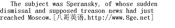 谈话涉及斯佩兰斯基, 他忽然被判处流刑以及有人捏造事实指控他叛国的消息甫才传到莫斯科了。 "Now he" (Speransky) "will be criticised and condemned by all who were enthusiastic about him a month ago," Prince Andrey was saying, "and were incapable of understanding his aims. It's very easy to condemn a man when he's out of favour, and to throw upon him the blame of all the mistakes of other people. But I maintain that if anything of value has been done in the present reign, it has been done by him-by him alone ..." He stopped, seeing Pierre. His face quivered, and at once assumed a vindictive expression. "And posterity will do him justice," he finished, and at once turned to Pierre. "Well, how are you, still getting stouter?" he said eagerly, but the new line was still more deeply furrowed on his forehead. "Yes, I'm very well," he answered to Pierre's question, and he smiled. It was clear to Pierre that his smile meant, "I am well, but my health is of no use to any one now."" 那些在一个月以前钦佩他的人如今都在审讯和指控他(斯佩兰斯基), "安德烈公爵说, "而且那班人没法明了他的意向。审讯一个失宠的人极为容易, 别人都归咎于他;所以我要说, 如果在目前的君主统治时期建树了什么佳债, 那末, 这一切佳绩都是他--他一人所建树的......"他看见皮埃尔后便停下来。他的面孔颤动了一下, 立刻流露出凶恶的表情。"惟有后代才会赐予他以正义。"他说完这句话, 旋即把脸转向皮埃尔。"你很好啊!越来越胖了, "他兴奋地说, 但是他的额头上又露出一条更深的皱纹。"是啊!我很健康, "他在回答皮埃尔的问话时冷冷一笑。皮埃尔十分清楚, 他的冷笑似乎在说: "很健康, 可是我的健康谁也不稀罕。" After saying a few words to Pierre of the awful road from the frontiers of Poland, of people he had met in Switzerland who knew Pierre, and of M. Dessalle, whom he had brought back from Switzerland as a tutor for his son, Prince Andrey warmly took part again in the conversation about Speransky, which had been kept up between the two old gentlemen. 安德烈公爵三言两语地跟皮埃尔谈到波兰边境后面的一条非常糟糕的道路, 他在瑞士遇见几个认识皮埃尔的人, 还谈到他从国外带来一个给儿子当教师的德萨尔先生, 然后他在两个老头继续谈论斯佩兰斯基时又激昂陈词。 "If there had been treason, and there were proofs of his secret relations with Napoleon, they would have made them public," he said, with heat and haste. "I don't and I didn't like Speransky personally, but I do like justice."" 既然他叛国, 他与拿破仑秘密勾结已有明证, 那么就要公诸于众, "他急躁而且匆忙地说。"我本人过去和现在都不喜欢斯佩兰斯基, 不过我喜欢维护正义。" Pierre recognized now in his friend that desire he knew only too well, for excitement and discussion of something apart from himself, simply in order to stifle thoughts that were too painful and too near his heart. 此时皮埃尔从他朋友身上发觉一种他甚为熟悉的强烈愿望--使他自己心潮澎湃、争论和他自己毫无关系的事情, 其目的在于压抑过分沉重的心情。