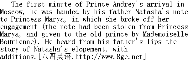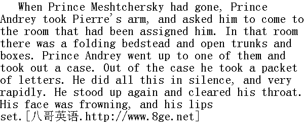 梅谢尔斯基公爵走后, 安德烈公爵挽着皮埃尔的手臂, 请他到给公爵准备的房间里去。在这个房间里可以看见一张铺好的床和几只打开的手提包和箱笼。安德烈公爵走到一只箱子前面, 取出一只小匣子。他从小匣子里拿出一扎用纸包着的东西。他默不作声, 动作迅速地做完这件事。之后他欠起身子, 咳嗽几声清清嗓子。他的面孔阴郁, 闭紧嘴唇。 "Forgive me, if I'm troubling you ..." Pierre saw that Prince Andrey was going to speak of Natasha, and his broad face showed sympathy and pity. That expression in Pierre's face exasperated Prince Andrey. He went on resolutely, clearly, and disagreeably: "I have received a refusal from Countess Rostov, and rumours have reached me of your brother-in-law's seeking her hand, or something of the kind. Is that true?"" 如果我麻烦你, 请原谅我......"皮埃尔明了, 安德烈公爵想谈论娜塔莎, 他那宽阔的脸上流露着同情和惋惜的神态。皮埃尔的面部表情激怒了安德烈公爵, 他坚决地、不高兴地大声说下去: "我遭受到伯爵小姐罗斯托娃的拒绝, 此外我还听到你的内兄向她求婚以及诸如此类的流言。是不是真有其事?" "Both true and untrue," began Pierre; but Prince Andrey cut him short." 是真又是假。"皮埃尔开口说, 但是安德烈公爵打断他的话。 "Here are her letters and her portrait," he said. He took the packet from the table and gave it to Pierre." 这儿是她的信件和相片, "他说。他从桌上拿起一包东西, 递给皮埃尔。 "Give that to the countess ... if you will see her."" 如果你看见伯爵小姐, 就把这样东西转交给她......"