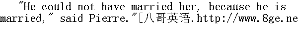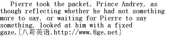 皮埃尔拿起一札信件。安德烈公爵仿佛在想, 他是否需要再对他说句什么话, 或者等待皮埃尔有没有什么话要说, 于是他把目光盯住皮埃尔。 "Listen. Do you remember our discussion in Petersburg?" said Pierre. "Do you remember about-?"" 您听我说, 您还记得我们在彼得堡时的那次争论吧, "皮埃尔说, "您还记得有关......?" "I remember," Prince Andrey answered hurriedly. "I said that a fallen woman should be forgiven, but I did not say I could forgive one. I can't."" 我记得, "安德烈公爵连忙回答, "我说过要原谅淫荡的女人, 但是我没有说过我能原谅她。我不能。" "How can you compare it? ..." said Pierre." 难道可以相提并论吗?......"皮埃尔说。 Prince Andrey cut him short. He cried harshly: "Yes, ask her hand again, be magnanimous, and all that sort of thing? ... Oh, that's all very noble, but I'm not equal to following in that gentleman's tracks. If you care to remain my friend, never speak to me of that ... of all this business. Well, good-bye. So you'll give that? ..." 安德烈公爵打断他的话。他用刺耳的嗓音叫嚷起来: "是啊, 又要向她求婚, 做个宽宏大量的人, 如此等等?......是的, 这倒很高尚, 但是我不擅长sur brisees de monsieur①。如果你愿意做我的朋友, 就永远不要和我谈这个......谈这一切。喂, 再见。那末你转交给她, 行吗?......" Pierre left him, and went in to the old prince and Princess Marya. 皮埃尔从房里走出去, 到老公爵和公爵小姐玛丽亚那里去了。 The old man seemed livelier than usual. Princess Marya was the same as usual, but behind her sympathy for her brother, Pierre detected her relief that her brother's marriage was broken off. Looking at them, Pierre felt what a contempt and dislike they all had for the Rostovs; felt that it would be impossible in their presence even to mention the name of the girl who could give up Prince Andrey for any one in the world. 老头子比平常显得更富有活力。公爵小姐玛丽亚还是那个老样子, 但因她与哥哥互有同感, 所以皮埃尔看出她对哥哥的婚事遭到挫折也感到高兴, 当皮埃尔望着他们的时候, 他心里明了, 他们对罗斯托夫一家人怀有极端蔑视和愤恨的心情, 而且明了, 在他们面前甚至不能提及那个宁可抛弃安德烈公爵而喜欢任何男人的姑娘的名字。 At dinner they talked of the coming war, of which there could now be no doubt in the near future. Prince Andrey talked incessantly, and argued first with his father, and then with Dessalle, the Swiss tutor. He seemed more eager than usual, with that eagerness of which Pierre knew so well the inner cause. 午宴之间的谈话涉及战争, 战争的临近逐渐地变得无可争议了。安德烈公爵滔滔不绝地谈话, 时而和父亲争论, 时而和瑞士籍教师德萨尔争论, 看来他比平常为振奋, 皮埃尔十分清楚地知道他所以精神振奋的原因。