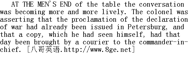 在男客就座的餐桌的一端, 谈话变得越来越热烈了。上校已经讲到, 彼得堡颁布了宣战文告, 他亲眼看见的一份文告已由信使递交总司令了。 "And what evil spirit must make us go to war with Bonaparte?" said Shinshin. "He has already made Austria take a back seat. I am afraid it may be our turn this time." " 真见鬼, 我们干嘛要和波拿巴作战?"申申说道, "Iladejarabattulecaquetal'autriche, Jecrainsquecettefoiscenesoitnotretowr。"① ①法语: 他已经打掉了奥地利的威风, 我怕现在要轮到我们了。 The colonel was a stout, tall, and plethoric German, evidently a zealous officer and good patriot. He resented Shinshin's words. 上校个子高大, 长得很结实, 是个活泼好动的德国人, 老军人和爱国者。申申的话使他生气了。 "The reason why, my good sir," he said, speaking with a German accent, "is just that the emperor knows that. In his proclamation he says that he cannot behold with equanimity the danger threatening Russia, and the security of the empire, its dignity, and the sacredness of its alliances." He laid a special emphasis on the word alliances, as though the gist of the matter lay in that word. And with the unfailing memory for official matters that was peculiar to him, he repeated the introductory words of the proclamation ... "and the desire, which constitutes the Sovereign's sole and immutable aim, to establish peace on a secure foundation, have determined him to despatch now a part of the troops abroad, and to make dispositions for carrying out this new project. That is the reason why, my dear sir," he concluded, tossing off a glass of wine in edifying fashion, and looking towards the count for encouragement. " 为什么, 阁下, "他说道, 把母音"唉"发成"爱", 把软音发成硬音, "皇帝知道这件事。他在文告中说道, 不能对俄国遭受威胁而熟视无睹, 不能对帝国的安全、它的尊严和盟国的神圣权利遭受威胁而熟视无睹, "他说道, 不知怎的特别强调"盟国的"这个词, 好像这就是问题的实质所在。他凭藉他那正确无讹的记忆公文的天赋, 把文告中的引言重说了一遍: "......国王的意愿, 他唯一的坚定不移的目标乃是: 在巩固的基础之上奠定欧洲的和平, 现已拟定调遣部分军队出国, 再度竭尽全部力量以企臻达此一目标。""阁下, 这就是为了什么。"他说了一句收尾的话, 露出教训人的神态, 一面喝完那杯葡萄酒, 看看伯爵的脸色, 想获得赞扬。