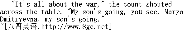 老是说战争, "伯爵从餐桌那边嚷道, "玛丽亚?德米特里耶夫娜, 要知道, 我的儿子要去作战了, 儿子要去作战了。" "And I've four sons in the army, but I don't grieve. All's in God's hands; one may die in one's bed, and in battle God may spare," Marya Dmitryevna's deep voice boomed back, speaking without the slightest effort from the further end of the table. " 我有四个儿子, 都在军队里服役, 我并不忧虑。一切都由上帝支配: 你是躺在灶台上死去;还是在战斗中得到上帝的保佑。"玛丽亚?德米特里耶夫娜从餐桌的那端用浑厚的嗓音毫不费劲地说道。 "That's true." " 真是这样。" And the conversation concentrated into two groups again, one at the ladies' end, and one at the men's. 谈话又集中火力了--女士在餐桌的一端, 男子汉在餐桌的另一端。 "You don't dare to ask!" said her little brother to Natasha, "and you won't ask!" " 你问不到什么, "小弟弟对娜塔莎说道, "你问不到什么!"