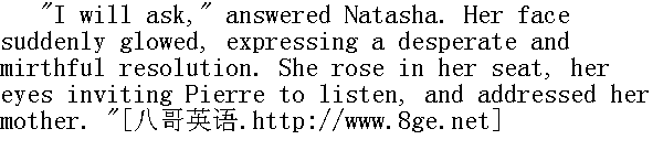 我一定要问。"娜塔莎答道。她的脸红起来了, 表现出无所顾忌的欢快的果断。她欠身起来一下, 向坐在对面的皮埃尔投以目光, 请他仔细听着, 又向母亲转过脸去说话。 "Mamma!" her childish contralto rang out over the table. " 妈妈!"整个餐桌都听见她的低沉洪亮的童音。 "What is it?" the countess asked in dismay; but seeing from her daughter's face that it was mischief, she shook her hand at her sternly, with a threatening and forbidding movement of her head. " 你干嘛?"伯爵夫人惊恐地问道, 但她凭女儿的脸色看出她在胡闹, 就向她严肃地挥挥手, 摇摇头, 装作威吓和遏制的样子。 All conversation was hushed. 谈话暂时停止了。 "Mamma! what pudding will there be?" Natasha's little voice rang out still more resolutely and deliberately. " 妈妈!有什么蛋糕?"娜塔莎脱口说出这句话, 她的嗓音听来更坚定。