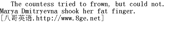 伯爵夫人想蹙起眉头, 可是她没法蹙起来。玛丽亚?德米特里耶夫娜伸出她那肥胖的指头, 威吓她。 "Cossack!" she said menacingly. " 哥萨克!"她用威吓的口气说。 Most of the guests looked at the parents, not knowing how they were to take this sally. 大多数客人都望着长辈, 不知道应当怎样应付这场恶作剧。 "I'll give it to you," said the countess. " 瞧我收拾你!"伯爵夫人说。 "Mamma! what pudding will it be?" Natasha cried, with bold and saucy gaiety, feeling sure that her prank would be taken in the right spirit. Sonya and fat little Petya were hiding their giggles. "You see I did ask," Natasha whispered to her little brother and Pierre, at whom she glanced again. " 妈妈!有蛋糕吃吗?"娜塔莎已经大胆任性、欢快地嚷起来, 她事先确信, 她的恶作剧会大受欢迎。索尼娅和胖乎乎的彼佳笑得躲藏起来, 不敢抬头。"你瞧, 我不是问了。"娜塔莎对小弟弟和皮埃尔轻言细语地说, 她又向皮埃尔瞥了一眼。