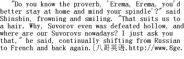 "Connaissezvousleproverbe, ①'叶廖马, 叶廖马, 你不如坐在家中, 把你的纺锤磨平。""申申蹙起眉头, 微露笑容, 说道, "Celanousconvientamerveille, ②苏沃洛夫顶什么用, 他也被打得aplatecouture③, 目前我们苏沃洛夫式的人物在哪里呢?Jevousdemandeunpeu."④他说道, 不断地从俄国话跳到法国语。 ①法语: 您知道这句谚语。 ②法语: 这对于我们非常适宜。 ③法语: 落花流水。 "We ought to fight to the last drop of our blood," said the colonel, thumping the table, "and to die for our emperor, and then all will be well. And to discuss it as little as possible," he concluded, turning again to the count, and drawling out the word "possible." "That's how we old hussars look at it; that's all we have to say. And how do you look at it, young man and young hussar?" he added, addressing Nikolay, who, catching that it was the war they were discussing, had dropped his conversation with Julie, and was all eyes and all ears, intent on the colonel. " 我们必须战斗到最后一滴血, "上校用手捶桌子, 说道, "为皇帝献身, 一切才会亨通。尽可能少地(在"可能"这个词上他把嗓音拖得特别长), 尽可能少地议长论短, "他把话说完了, 又朝伯爵转过脸来, "这就是我们老骠骑兵的论点, 没有别的话要说了。年轻人和年轻的骠骑兵, 您怎样评论呢?"他把脸转向尼古拉, 补充一句话。尼古拉听到话题涉及战争后, 便丢开对方不管, 睁大两眼, 全神贯注地谛听上校说话。 "I perfectly agree with you," answered Nikolay, growing hot all over, twisting his plate round, and changing the places of the glasses with a face as desperate and determined as though he were exposed to great danger at that actual moment. "I am convinced that the Russians must die or conquer," he said. He was himself, like the rest of the party, conscious after the words were uttered that he had spoken with an enthusiasm and fervour out of keeping with the occasion, and so he was embarrassed. " 完全同意您的看法, "尼古拉答道, 他面红耳赤, 一面转动着盘子, 挪动着几只酒杯, 脸上露出坚决的无所顾忌的神情, 好像他眼前遭受到严重的危险似的, "我深信, 俄国人都要为国捐躯, 或者会赢得胜利。"他说道。正如其他人在这种时分说出过分激动的不是恰如其分的话那样, 他也有同样的感受。 "That was very fine, what you just said," Julie sitting beside him said breathlessly. Sonya trembled all over and crimsoned to her ears, and behind her ears, and down her neck and shoulders, while Nikolay was speaking. Pierre listened to the colonel's remarks, and nodded his head approvingly. "C'estbienbeaucequevousvenezdedire "①朱莉坐在他身旁叹息道。当尼古拉说话时, 索尼娅全身颤抖起来, 脸红到耳根, 从耳根红到脖子, 从脖子红到肩膀。皮埃尔谛听上校说话, 点点头, 表示赞同。 "That's capital," said he. " 这么说真好。"他说道。 "You're a true hussar, young man," the colonel shouted, thumping on the table again. " 地道的骠骑兵, 年轻人。"上校又捶了一下桌子, 嚷道。 "What are you making such a noise about over there?" Marya Dmitryevna's bass voice was suddenly heard asking across the table. "What are you thumping the table for?" she addressed the colonel. "Whom are you so hot against? You imagine, I suppose, that the French are before you?" " 你们在那里吵什么?"忽然从餐桌那边传来玛丽亚?德米特罗耶夫娜低沉的语声。"你为什么要捶桌子呢, "她把脸转向骠骑兵说道, "你对什么人动肝火?你真的以为现在你面前就有一群法国人!" "I speak the truth," said the hussar, smiling. " 我说的是真话。"骠骑兵面露微笑说道。
