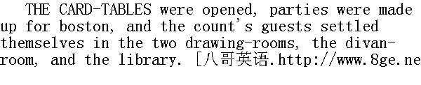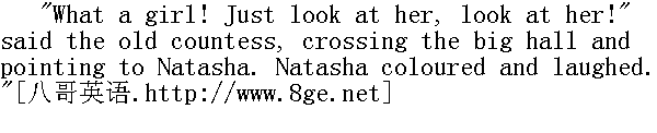 她是啥模样?她是啥模样?你们看吧, 你们看吧。"老伯爵夫人走过大厅, 用手指着娜塔莎, 说道。娜塔莎两颊通红, 笑了起来。 "Why, what do you mean, mamma? Why should you laugh? Is there anything strange about it?" " 妈妈, 怎么啦?您何苦呢?这有什么奇怪的呢?" In the middle of the third ecossaise there was a clatter of chairs in the drawing-room, where the count and Marya Dmitryevna were playing, and the greater number of the more honoured guests and elderly people stretching themselves after sitting so long, put their pocket-books and purses in their pockets and came out to the door of the big hall. In front of all came Marya Dmitryevna and the count, both with radiant faces. The count gave his arm, curved into a hoop, to Marya Dmitryevna with playfully exaggerated ceremony, like a ballet-dancer. He drew himself up, and his face beamed with a peculiar, jauntily-knowing smile, and as soon as they had finished dancing the last figure of the ecossaise, he clapped his hands to the orchestra, and shouted to the first violin: "Semyon! do you know 'Daniel Cooper'? 第三节苏格兰民间舞曲奏到半中间时, 客厅里的坐椅被移动了, 伯爵和玛丽亚?德米特里耶夫娜、大部分贵宾和老年人都在这里打纸牌, 他们久坐之后伸伸懒腰, 把皮夹和钱包放进衣袋里, 一个个向大厅走去。玛丽亚?德米特里耶夫娜随同伯爵走在最前面, 二人都现出喜悦的神色。伯爵诙谐地装出拘礼的样子, 有点像跳芭蕾舞似的, 把他那圆圆的手臂伸给玛丽亚?德米特罗耶夫娜。他挺直身子, 神采奕奕, 流露出特别洒脱的机智的微笑。一跳完苏格兰民间舞, 他就向乐师击掌, 面对第一提琴手, 向那合唱队吼叫: "谢苗!你熟悉《丹尼拉?库波尔》么?" That was the count's favourite dance that he had danced in his youth. (Daniel Cooper was the name of a figure of the anglaise.) 这是伯爵青年时代喜欢跳的一种舞蹈。(《丹尼拉?库波尔》其实是英吉利兹舞的一节。) "Look at papa!" Natasha shouted to all the room (entirely forgetting that she was dancing with a grown-up partner), and ducking down till her curly head almost touched her knees, she went off into her ringing laugh that filled the hall. Every one in the hall was, in fact, looking with a smile of delight at the gleeful old gentleman. Standing beside his majestic partner, Marya Dmitryevna, who was taller than he was, he curved his arms, swaying them in time to the music, moved his shoulders, twirled with his legs, lightly tapping with his heels, and with a broadening grin on his round face, prepared the spectators for what was to come. As soon as the orchestra played the gay, irresistible air of Daniel Cooper, somewhat like a livelier Russian trepak, all the doorways of the big hall were suddenly filled with the smiling faces of the house-serfs-men on one side, and women on the other-come to look at their master making merry. " 瞧我爸爸吧。"娜塔莎朝着整个大厅嚷道(根本忘记了她在和大人一同跳舞), 她把长有鬈发的头向膝盖微微垂下, 非常洪亮的笑声响彻了厅堂。诚然, 大厅里的人都含着欢快的微笑打量那个愉快的老人, 一个比他高大的显赫的女士--玛丽亚?德米特里耶夫娜站在他身旁, 他那手臂蜷曲成圆形, 合着拍子摇晃着, 舒展开双肩, 两脚向外撇开, 轻盈地踏着拍子, 他圆滚滚的脸上越来越眉开眼笑, 让观众准备欣赏将要出现的场景。一当听见欢快的、引人入胜的、与快乐的《特烈帕克》舞曲相似的《丹尼拉?库波尔》舞曲, 大厅的几个门口蓦然堆满了家仆的笑脸, 一旁是男仆, 一旁是女仆, 他们都出来观看尽情作乐的老爷。