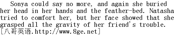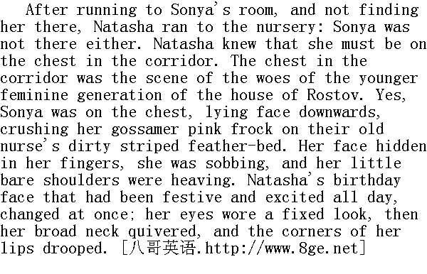 娜塔莎跑进索尼娅房里, 找不到她的女友, 便跑到儿童室去了, 那里也没有索尼娅的人影。娜塔莎明白, 索尼娅呆在走廊里的箱笼上。走廊里的箱笼是罗斯托夫家年轻妇女们倾吐哀愁的地方。诚然, 索尼娅呆在箱笼上, 俯卧在保姆那张邋遢的条纹绒毛褥子上, 她身上穿的粉红色的薄纱连衣裙都给揉皱了。她用手蒙着脸, 哽噎得大声痛哭, 赤裸裸的肩膀不住地颤抖。娜塔莎整天价因为过命名日而喜形于色, 这时分脸色突然变了, 她的视线呆滞不动了, 之后她的宽大的脖子颤抖了一下, 嘴角松垂下来了。 "Sonya! what is it? ... what's the matter with you? Oo-oo-oo! ..." and Natasha, letting her big mouth drop open and becoming quite ugly, wailed like a baby, not knowing why, simply because Sonya was crying. Sonya tried to lift up her head, tried to answer, but could not, and buried her face more than ever. Natasha cried, sitting on the edge of the blue feather-bed and hugging her friend. Making an effort, Sonya got up, began to dry her tears and to talk. " 索尼娅, 你怎么样?......您是怎么回事?呜--鸣--呜!......"娜塔莎咧开大嘴哭起来了, 样子变得十分难看, 她像儿童似地嚎啕大哭, 不知为什么, 只是因为索尼娅哭泣的缘故。索尼娅想要抬起头来, 想回答她的话, 可是没法这样办, 她把头藏得更深了。娜塔莎哭着, 在蓝色的绒毛褥子上坐下, 一面拥抱着女友。索尼娅鼓足一股劲, 欠起身子, 揩掉眼泪, 开始述说起来。 "Nikolinka's going away in a week, his ... paper ... has come ... he told me himself. ... But still I shouldn't cry ..." (she showed a sheet of paper she was holding in her hand; on it were verses written by Nikolay). "I shouldn't have cried; but you can't ... no one can understand ... what a soul he has." " 过一个礼拜尼古连卡要去打仗了, 他的......公文......下达了......他亲自对我说了......我并不想哭哩......"她让娜塔莎看看她拿在手里的一张纸条, 那是尼古拉写的诗句, "我并不想哭哩, 可是你没法了解......谁也没法了解......他的心肠多么好啊。" And again she fell to weeping at the thought of how noble his soul was. 她于是又哭起来, 哭他的心肠太好。 "It's all right for you ... I'm not envious ... I love you and Boris too," she said, controlling herself a little; "he's so nice ... there are no difficulties in your way. But Nikolay's my cousin ... the metropolitan chief priest himself ... has to ... or else it's impossible. And so, if mamma's told" (Sonya looked on the countess and addressed her as a mother), "she'll say that I'm spoiling Nikolay's career, that I have no heart, that I'm ungrateful, though really ... in God's name" (she made the sign of the cross) "I love her so, and all of you, only Vera ... Why is it? What have I done to her? I am so grateful to you that I would be glad to sacrifice everything for you, but I have nothing. ..."" 你觉得挺好......我不妒嫉......我爱你, 也爱鲍里斯, "她聚精会神地说道, "他是个可爱的人......对你们毫无妨碍。可是尼古拉是我的表兄......有必要......总主教本人允准......即使那样也不行。而且, 若是妈妈(索尼娅认为伯爵夫人是母亲, 把她称呼为母亲)......她说我断送尼古拉的锦绣前程, 我没有好心眼我忘恩负义, 说实话......真的......"她在胸前划了个十字, "我这样爱她, 也爱你们大家, 唯独薇拉......为什么?我有什么对她过不去呢?我十分感谢你们, 我乐于为你们牺牲一切, 但是我没有什么可以......"