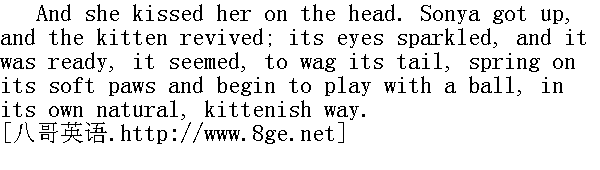 她于是吻她的头。索尼娅稍微抬起身子来, 那只小猫也活跃起来了, 一双小眼睛闪闪发光, 它好像就要摇摇尾巴, 伸出四双柔软的脚爪霍地跳起来, 又要去玩耍线团, 好像它适宜于这种游戏似的。 "Do you think so? Really? Truly?" she said rapidly, smoothing her frock and her hair. " 你是这样想的吗?说的是实在的话?真的?"她说道, 一面飞快地弄平连衣裙和头发。 "Really, truly," answered Natasha, putting back a stray coil of rough hair on her friend's head; and they both laughed. "Well, come along and sing the 'Spring.' " " 说实话吗?真的吗?"娜塔莎答道, 一面给她的朋友弄平辫子下面露出来的一绺粗硬的头发。她们二人都笑了起来。"喂, 我们去唱《泉水》这首歌吧。" "Let's go, then." " 我们去吧。" "And do you know that fat Pierre, who was sitting opposite me, he's so funny!" Natasha said suddenly, stopping. "I am enjoying myself so," and Natasha ran along the corridor. " 你可知道, 坐在我对面的这个胖乎乎的皮埃尔多么滑稽可笑!"娜塔莎停步时忽然说道, "我觉得非常快活!"