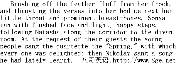 娜塔莎于是在走廊里跑起来了。索尼娅拍掉身上的绒毛, 把诗藏在怀里靠近突出的胸骨的脖子旁边, 她两颊通红, 迈着轻盈而快活的步子, 跟在娜塔莎身后沿着走廊向摆满沙发的休息室跑去。年轻人应客人之请唱了一首人人喜欢的四人合唱曲《泉水》之后尼古拉还唱了一首已经背熟的歌曲: "How sweet in the moon's kindly ray, 在令人欣悦的晚上, In fancy to thyself to say, 在皎洁月色映照下, That earth holds still one dear to thee! 你想象这该是多么幸福: Whose thoughts, whose dreams are all of thee! 有个什么人在这尘世上, 她心中暗自把你思念!