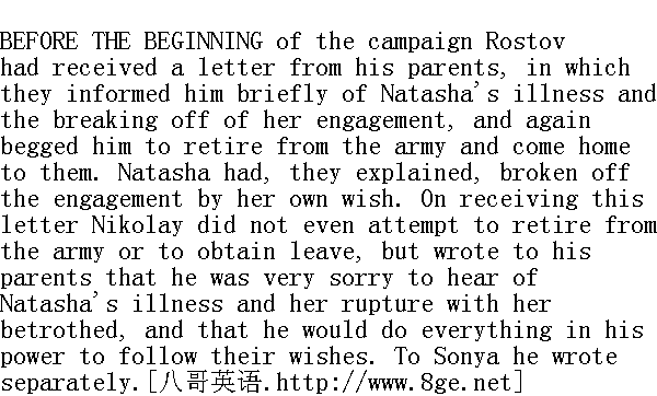 罗斯托夫在开战前收到一封父母的来信, 信中简短地告知他关于娜塔莎的病情以及与安德烈公爵解除婚约的事(他们向他解释说婚约是娜塔莎主动回绝的), 他们又要求他退伍回家去, 尼古拉接到信后并未打算请假或退伍, 而是给父母写信说他非常惋惜娜塔莎的病情和退婚, 他将尽力做好一切, 以实现他们的愿望。他单独给索尼娅写了一封信。 "Adored friend of my heart," he wrote; "nothing but honour could avail to keep me from returning to the country. But now, at the beginning of a campaign, I should feel myself dishonoured in my comrades' eyes, as well as my own, if I put my own happiness before my duty and my love for my country. But this shall be our last separation. Believe me, immediately after the war, if I be living and still loved by thee, I shall throw up everything and fly to thee to press thee for ever to my ardent breast."" 我心灵中的最亲爱的朋友, "他写道, "除了荣誉, 什么也不能阻止我返回你身边。但是现在, 在开战前夕, 如果我把我个人的幸福置于对祖国的责任和爱之上, 那么, 不仅在全体同事面前, 而且在我自己面前, 我都是不光彩的。然而--这是最后一次离别了。请相信, 战争结束后, 假如我还活着, 你还爱我的话, 我将抛开一切, 立刻飞到你的身边, 把你永远拥抱在我火热的胸前。" It was, in fact, only the outbreak of the war that detained Rostov and hindered him from returning home, as he had promised, and marrying Sonya. The autumn at Otradnoe with the hunting, and the winter with the Christmas festivities and Sonya's love had opened before his imagination a vista of peace and quiet country delights unknown to him before, and this prospect now lured him back. "A charming wife, children, a good pack of hounds, ten to twelve leashes of swift harriers, the estate to look after, the neighbours, election to offices, perhaps, by the provincial nobility," he mused. But now war was breaking out, and he had to remain with his regiment. And since this had to be, Nikolay Rostov was characteristically able to be content too with the life he led in the regiment, and to make that life a pleasant one. 确实, 只因为要开战才使罗斯托夫留了下来, 耽误了他回家--他曾答应过--回去同索尼娅结婚, 奥特拉德诺耶狩猎的秋季和伴着圣诞节和索尼娅的爱情的冬天, 在他面前展示了一幅幽静的乡村生活图画, 那种观乐而宁静的生活他以前并不了解, 而现在却那样吸引着他。"一个贤慧的妻子, 几个孩子, 一群好猎狗, 十至十二群凶猛的灵狸, 农活、邻居, 被选举为公众服务!"他想。可是, 现在是在打仗, 应该留在团队里, 既然非要如此不可, 尼古拉·罗斯托夫根据自己的性格来看, 对团队生活也还满意, 也能在这种生活中找到乐趣。 On his return from his leave, Nikolay had been joyfully welcomed by his comrades and sent off for remounts. He succeeded in bringing back from Little Russia some first-rate horses that gave him great satisfaction, and won him the commendation of his superior officers. In his absence he had been promoted to be captain, and when the regiment was being made ready with reinforcements for active service, he was again put in command of his old squadron. 休假回来, 同伴们高兴地迎接他, 尼古拉被派去置办补充马匹, 他从小俄罗斯(乌克兰)领回了好马, 这使他很高兴, 而且也博得长官的赞赏。在他外出时, 他被提升为骑兵大尉, 当团队按战时编制扩大名额时, 他又回到原来所在的骑兵连。 The campaign was beginning, pay was doubled, the regiment was reinforced with new officers, new men, and fresh horses, and had moved into Poland. The temper of eager cheerfulness, always common at the beginning of a war, was general in the army, and Rostov, fully conscious of his improved position in the regiment, gave himself up heart and soul to the pleasures and interests of the army, though he knew that sooner or later he would have to leave it. 战争开始了, 团队向波兰进发, 发了双饷, 来了新的军官、新的士兵和新的马匹;主要的是队伍中普遍有一种伴随战争伊始的兴奋而欢乐的情绪;而罗斯托夫, 意识到自己在团队中的有利地位, 完全沉浸在军队生活的欢乐和趣味中, 虽然他知道早晚会失去这种生活。