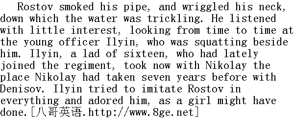 由于雨水流进了领口而缩着脖子的罗斯托夫吸着烟斗, 漫不经心地听着, 不时看看那位依偎着他的年轻军官伊林。这位军官是一位十六岁的男孩子, 不久前才来团里, 他现在与尼古拉的关系就像七年前尼古拉与杰尼索夫的关系一样, 伊林在各方面都尽力模仿罗斯托夫, 像一个女人似地爱着他。 The officer with the double moustaches, Zdrzhinsky, in a very high-flown manner, described the dike at Saltanov as the Russian Thermopylae, and the heroic deed of General Raevsky on that dike as worthy of antiquity. Zdrzhinsky told then how Raevsky had thrust his two sons forward on the dike under a terrific fire, and had charged at their side. Rostov listened to the tale, and said nothing betokening sympathy with Zdrzhinsky's enthusiasm. He looked, indeed, as though ashamed of what he was told, but not intending to gainsay it. After Austerlitz and the campaign of 1807, Rostov knew from his own experience that men always lie when they describe deeds of battle, as he did himself indeed. He had had too sufficient experience to know that everything in battle happens utterly differently from our imagination and description of it. And so he did not like Zdrzhinsky's story, and did not, indeed, like Zdrzhinsky himself, who had, besides his unprepossessing moustaches, a habit of bending right over into the face of the person he was speaking to. He was in their way in the cramped little shanty. Rostov looked at him without speaking. "In the first place, on the dike they were charging there must have been such a crowd and confusion that, if Raevsky really thrust his sons forward, it would have had no effect except on the dozen men closest to him," thought Rostov; "the rest could not have even seen who were with Raevsky on the dike. And those who did see it were not likely to be greatly affected by it, for what thought had they to spare for Raevsky's tender, parental feelings, when they had their own skins to think of saving? And besides the fate of the country did not depend on whether that dike was taken or not, as we are told the fate of Greece did depend on Thermopylae. And then what was the object of such a sacrifice? Why do your own children a mischief in war? I wouldn't put Petya, my brother, in a place of danger; no, even Ilyin here, who's nothing to me but a good-natured lad, I would do my best to keep safe and sheltered," Rostov mused, as he listened to Zdrzhinsky. But he did not give utterance to his thoughts, he had experience of that too. He knew that this tale redounded to the glory of our arms, and therefore one must appear not to doubt its truth: and he acted accordingly. 留着两撇胡子的军官--兹德尔任斯基眉飞色舞地讲着, 他说萨尔塔诺夫水坝是俄罗斯的忒摩比利。在这座水坝上拉耶夫斯基将军的行动堪与古代英雄媲美。兹德尔任斯基讲述了拉耶夫斯基迎着可怕的炮火, 带着两个儿子冲上水坝, 父子并肩战斗的事迹。罗斯托夫听着这个故事不仅没有讲话, 附和兹德尔任斯基的喜悦心情, 而且相反, 却露出羞于听他讲述的样子, 虽然他无意反驳他。在奥斯特利茨和一八○七年战役之后, 凭自己一个人的经验, 罗斯托夫知道, 人们讲述战绩时, 总是会说谎, 他自己就扯过谎;其次, 他有丰富的经验, 知道在战场上发生的一切, 与我们想象和讲述的全不一样。因而他并不喜欢兹德尔任斯基的故事, 也不喜欢兹德尔任斯基本人, 这个满脸胡子的人有个习惯, 老是俯身凑近听他说话的人的脸, 在狭窄的棚子里紧挨着罗斯托夫, 罗斯托夫默默地看着他。"第一, 在那个人们冲击的水坝上一定非常混乱和拥挤, 如果拉耶夫斯基领着儿子冲上去, 那么, 除了他周围的十几个人外, 再也不能影响其他人。"罗斯托夫想, "其余的人不可能看见拉耶夫斯基是怎样以及同谁冲上水坝的。而且那些看见此事的人也不会大为感动, 因为在那性命攸关的时刻, 谁还去注意拉耶夫斯基的案情呢?再说, 能否夺取萨尔塔诺夫水坝与祖国的命运无关, 不能与忒摩比利相比。既然如此, 为什么要做出这样的牺牲呢?又为何要让儿子也参加战斗呢?换了我的话, 不仅不会把弟弟彼佳带去, 而且连伊林--虽不是我的亲人, 但却是个善良的男孩, 也要尽力设法安置到某个安全的地方。"罗斯托夫一边继续想着, 一边听着兹德尔任斯基讲。但是他并不说出自己的思想、在这方面他是有经验的。他知道这类故事可以为俄军增光, 所以要做出毫不怀疑的样子。他就是这样做的。 "I can't stand this, though," said Ilyin, noticing that Rostov did not care for Zdrzhinsky's story; "stockings and shirt, and all-I'm wet through. I'm going to look for shelter. I fancy the rain's not so heavy." Ilyin ran out and Zdrzhinsky rode away." 我可受不了啦。"发现罗斯托夫不喜欢兹德尔任斯基的谈话, 伊林就说道, "袜子、衬衫都湿透了。我要去找个避雨的地方。好像雨下得小了些。"伊林走出去了, 兹德尔任斯基也跟着就离开了。 Five minutes later Ilyin came splashing through the mud to the shanty. 五分钟后, 伊林在泥泞中啪嗒啪嗒地跑回棚子。 "Hurrah! Rostov, make haste and come along. I have found an inn, two hundred paces or so from here; a lot of our fellows are there already. We can get dry anyway, and Marya Hendrihovna's there."" 乌拉!罗斯托夫, 我们快走。找到了!离这儿两百来步有一个小酒馆, 我们的人都已聚在那儿了。至少我们可以把衣服烤一烤。玛丽亚·亨里霍夫娜也在那儿。"