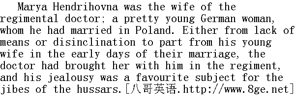 玛丽亚·亨里霍夫娜是团队医生的妻子, 是医生在波兰娶的一位年轻、漂亮的德国女人, 医生不是由于没有财产, 就是因为新婚初期不愿离开年轻的妻子, 就带着她随军东奔西走, 在骠骑军官中, 医生的醋意倒成了通常取笑的话题。 Rostov flung on a cape, shouted to Lavrushka to follow them with their things, and went off with Ilyin, slipping in the mud, and splashing through the pools in the drizzling rain and the darkness, which was rent at intervals by distant lightning. 罗斯托夫披上斗篷, 叫拉夫鲁什卡带着东西跟着自己, 随后与伊林一起走了。他们在漆黑的夜里冒着小雨, 踏着泥泞, 蹚着积水行进, 远方的雷电不时划破黑暗的夜空。 "Rostov, where are you?"" 罗斯托夫, 你在哪儿?" "Here. What a flash!" they called to one another as they went." 在这里。好大的闪电!"他们彼此交谈着。