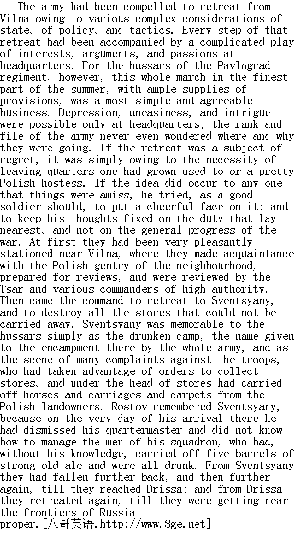 由于各种复杂的, 国家的、政治的和战略的原因, 军队从维尔纳撤退了。后退的每一步在总司令部中都伴随各种利害冲突, 各种论断和感情的复杂变化, 对保罗格勒兵团的骠骑兵来说, 在夏季最好的季节, 带着充足的给养进行这种退却是最简单最愉快的事情。泄气、不安和阴谋只有在总司令部才有, 而在一般官兵中, 人们是不去问到哪里去, 为什么而去, 如果有人为撤退而惋惜, 也只是因为不得不离开久已住惯的营房, 告别漂亮的波兰姑娘罢了。假如有谁觉得事情不妙, 那么也会像一个优秀军人应有的样子, 强作快活, 不去想整个局势, 而只顾眼前的事。当初是多么快活, 驻扎在维尔纳附近, 与波兰地主交往, 期待并且受到皇帝和其他高级司令官的检阅。后来传来向斯文齐亚内撤退的命令, 销毁不能带走的给养。斯文齐亚内值得骠骑兵们记忆, 只因为这是一个"醉营", 这是全军送给斯文齐亚内营盘的外号, 还因为在斯文齐亚内军队受到许多控告, 指控他们利用征收给养的命令, 同时夺走了波兰地主的马匹、车辆和地毯。罗斯托夫记得斯文齐亚内, 是因为他进入这个镇的第一天就撤换了司务长, 还因为他无力应付骑兵连的所有醉鬼, 这些人瞒着他偷了五桶陈年啤酒。从斯文齐亚内继续撤退直到德里萨, 又从德里萨撤退, 已经接近俄罗斯边境了。 On the 13th of July the Pavlograd hussars took part in their first serious action. 七月十三日保罗格勒兵团第一次发生了严重的事情。 On the previous evening there had been a violent storm of rain and hail. The summer of 1812 was remarkably stormy throughout. 七月十二日夜里, 出事的前夜, 下了一场带冰雹的暴风雨, 一八一二年的夏季总的说来是一个以暴风雨著称的夏季。 The two Pavlograd squadrons were bivouacking in the middle of a field of rye, which was already in ear, but had been completely trodden down by the cattle and horses. The rain was falling in torrents, and Rostov was sitting with a young officer, Ilyin, a protege of his, under a shanty, that had been hastily rigged up for them. An officer of their regiment, adorned with long moustaches, that hung down from his cheeks, was caught in the rain on his way back from visiting the staff, and he went into Rostov's shanty for shelter. 保罗格勒兵团的两个骑兵连宿营在一片已经抽穗但却被马完全踩倒的黑麦地里。天下着瓢泼大雨, 罗斯托夫和一位他所护卫的年轻军官伊林坐在临时搭的棚子里, 他们团里一位留着长长络腮胡子的军官, 去司令部后回来的路上遇雨, 便顺路来看罗斯托夫。 "I'm on my way from the staff, count. Have you heard of Raevsky's exploit?" And the officer proceeded to relate to them details of the Saltanov battle that had been told him at the staff." 伯爵, 我从司令部来, 您听见过拉耶夫斯基的功勋吗?"这位军官便把他在司令部听来的关于萨尔塔诺夫战役的详请讲了一遍。