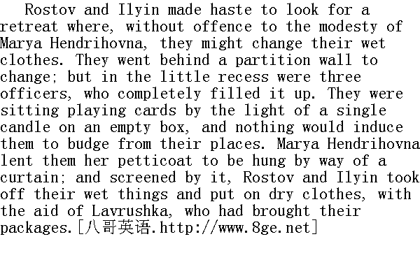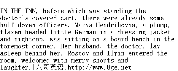 门前停着医生篷车的小酒馆已经聚集了五六个军官。玛丽亚·亨里霍夫娜, 一位胖胖的, 长着淡黄色头发的德国女人, 身穿短外套头戴睡帽, 坐在一进门的屋角一张宽凳上。她的医生丈夫在她后面睡觉。罗斯托夫和伊林迎着一阵欢快的惊叫和笑声, 走进了屋子。 "I say! You are having a jolly time here!" said Rostov, laughing." 嗬, 你们这儿好快活。"罗斯托夫笑着说。 "And what are you yawning over?"" 您怎么错过了好时光?" "Pretty figures you look! There's a perfect waterfall from them! Don't swamp our drawing-room."" 好家伙!这对落汤鸡!不要把我们的客厅弄湿了。" "Mind you don't spatter Marya Hendrihovna's dress," chimed in voices." 不要弄脏了玛丽亚·亨里霍夫娜的衣裳。"几个声音一齐答道。