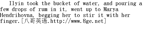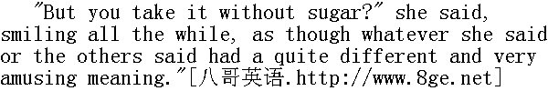 可您并未放糖啊?"她总是微笑着说, 仿佛她说什么或别人说些什么都很可笑, 别有用意似的。 "I don't care about sugar, all I want is for you to stir it with your little hand."" 我不要糖, 只想您亲手搅搅就行了。" Marya Hendrihovna began looking for the spoon, which some one had pounced upon. 玛丽亚·亨里霍夫娜同意了, 开始找把被谁拿走了的茶匙。 "Use your little finger, Marya Hendrihovna," said Rostov; "it will be all the sweeter."" 您用手指头搅吧, 玛丽亚·亨里霍夫娜, "罗斯托夫说, "这样更好。" "It's hot," said Marya Hendrihovna, blushing with pleasure." 烫!"玛丽亚·亨里霍夫娜高兴得红了脸, 说道。