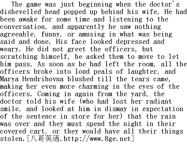 游戏刚开始, 医生蓬乱的头就从玛丽亚·亨里霍夫娜身后抬了起来。他早就醒了, 仔细听着人们在说些什么, 显然, 他认为人们所说的和所做的一切都没什么可乐、可笑和好玩。他的脸郁闷而颓丧。他没同军官们打招呼, 搔了搔头, 请挡路的人让他过去。他刚一走出去, 全体军官就哄然大笑, 而玛丽亚·亨里霍夫娜脸红得涌出了泪水, 这么一来, 在全体军官眼中, 她更有吸引力了。医生从外面返了回来, 对妻子说(她已经不再现出幸福的笑容, 惊恐地看着他, 等待着判决), 雨已经停了, 要去篷车里过夜, 不然东西要被人偷光了。 "But I'll put an orderly on guard ... two, indeed!" said Rostov. "That's nonsense, doctor."" 我派一个勤务兵上去守着, 派两个!"罗斯托夫说, "就这样, 医生。" "I'll be sentinel myself!" said Ilyin." 我亲自去站岗!"伊林说。 "No, gentlemen, you have had plenty of sleep, but I have been up these two nights," said the doctor, and he sat gloomily by his wife's si" 不, 先生们, 你们已经睡过觉了, 而我可两夜未合眼。"医生说着, 闷闷不乐地在妻子旁边坐下, 等着玩牌游戏结束。de, waiting for the end of the game. Looking at the doctor's gloomy face and sidelong glances at his wife, the officers grew even more lively, and many of them could not suppress their laughter, for which they hastily sought presentable pretexts. When the doctor had led his wife away, and settled himself with her in their cart, the officers lay down in the inn, covering themselves with their wet overcoats. But for a long while they stayed awake, chatting, recalling the dismay of the doctor, and the delight of the doctor's wife, or running out on to the steps to report on what was going on in the cart. Several times Rostov muffled his head up and tried to go to sleep. But again some remark roused him, again a conversation sprang up, and again there were peals of causeless, merry, childish laughter. 医生阴沉着脸, 斜视着自己的老婆, 军官们望着他那个样子更乐了, 许多人忍不住笑出声来, 赶紧尽力为他们的笑找一个无伤大雅的借口。医生领着老婆离开了并一起进了篷车, 军官们也在小酒馆里躺了下来, 盖上潮湿的军士衣;但是他们久久不能入睡, 时而谈论医生刚才的惶惶不安和他老婆的兴高采烈, 时而跑到外面, 通报篷车里有什么动静。罗斯托夫好几次蒙上头想入睡, 却又有什么评论吸引了他, 就又开始谈起来, 又传出了无缘无故的、快活的、天真的笑声。