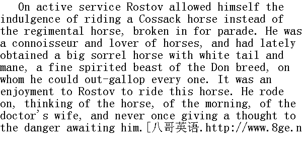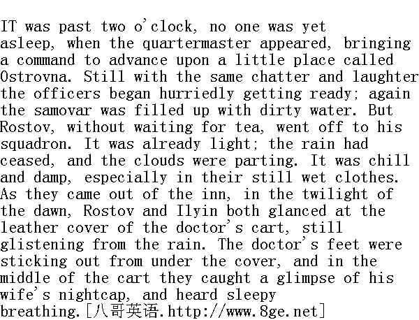 两点多钟了, 谁也没有睡着, 司务长此时进来传达了进驻奥斯特罗夫纳镇的命令。 军官们仍然有说有笑, 急忙开始做出发的准备;他们又烧了一茶炊不干净的水。可是罗斯托夫不等茶水烧好, 就去骑兵连了。天已经亮了, 雨也停了, 乌云正散去。既湿又冷, 特别是穿着没有干透的衣服更是这样。从小酒肆出来, 罗斯托夫和伊林在晨光中端详了一下被雨淋得发亮的医务车的皮篷, 车帷下面露出医生的两只脚, 可以看见在车中间的坐垫上医生老婆的睡帽, 听得见她熟睡中的呼吸声。 "She's really very charming," said Rostov to Ilyin." 真的, 她太迷人了!"罗斯托夫对与他一起出来的伊林说道。 "An exquisite woman!" responded Ilyin, with all the gravity of a boy of sixteen." 多么迷人的女人!"十六岁的伊林一本正经地答道。 Half an hour later the squadron stood drawn up on the road. The word of command was heard, "Mount!" and the soldiers crossed themselves and got on their horses. Rostov, riding ahead of them, gave the word: "Forward!" and drawing out four abreast, the hussars started with a sound of subdued talk, splashing hoofs, and jingling sabres. They trotted along the broad high-road, with birch-trees on each side of it, following the infantry and artillery, who had gone on before. 半小时后, 排好队的骑兵连站在大路上。只听见口令: "上马!"士兵们在胸前画了个十字就开始上马。在前面骑着马的罗斯托夫命令道: "开步走!"于是, 骠骑兵们四人一排沿着两旁长着白桦树的大道, 跟在步兵和炮兵后面开拔了, 只听见马蹄踩在泥泞的路上的噗哧声, 佩刀的锵锵声和轻轻的谈话声。 The broken, purplish-blue clouds, flushed red by the sunrise, were scudding before the wind. It grew lighter and lighter. They could see distinctly, still glistening from the rain, the feathery grass which always grows beside by-roads. The drooping branches of the birch-trees swayed in the wind, and dripped bright drops aslant across the road. The faces of the soldiers showed more and more distinctly. Rostov, with Ilyin, who would not drop behind, rode on one side of the road between the two rows of birch-trees. 在泛红的东方, 青紫色的浓云的碎片很快被风吹散了, 天越来越亮了。乡村道路上总是生长着的卷曲的小草, 由于夜雨的湿润看起来更加鲜亮了;低垂的白桦树枝条湿漉漉的, 轻风吹过摇摇晃晃, 斜斜地撒下晶莹的水珠。士兵的脸孔越发看得清楚了。罗斯托夫与紧紧跟着他的伊林骑着马在两行白桦树之间的路旁行进。