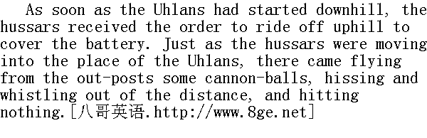 枪骑兵刚冲到山下, 骠骑兵就奉命上山掩护炮兵。骠骑兵刚在枪骑兵的阵地上停下来, 就从散兵线那儿远远地飞来咝咝呼啸的炮弹, 没有命中。 This sound, which he had not heard for so long, had an even more inspiriting and cheering effect on Rostov than the report of the muskets. Drawing himself up, he surveyed the field of battle, as it opened out before him riding uphill, and his whole heart went with the movements of the Uhlans. They were swooping down close upon the French dragoons; there was some confusion yonder in the smoke, and five minutes later the Uhlans were dashing back, not towards the spot where they had been posted, but more to the left. Between the ranks of Uhlans on the chestnut horses, and in a great mass behind them, could be seen blue French dragoons on grey horses. 罗斯托夫好久没有听到这种声音了, 心里觉得比以前的射击声更使他高兴和兴奋。他挺直身子, 察看山前开阔的战场, 全心关注着枪骑兵的行动。枪骑兵向法军龙骑兵扑过去, 在烟雾蒙蒙中混成一团, 过了五分钟, 枪骑兵退了回来, 他们不是退回到他们原来呆的地方, 而是退向左边。在骑枣红马的橙黄色的枪骑兵中间和后面是一大片骑灰色马、身着蓝色制服的法军龙骑兵。
