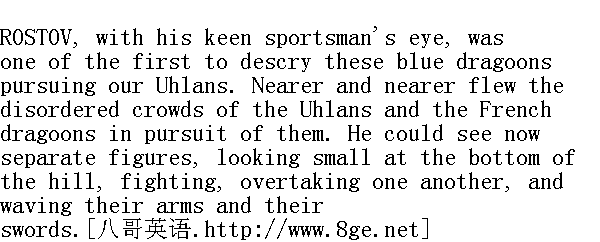 罗斯托夫以自己锐利的猎人的眼睛第一个望见这些蓝色的法国龙骑兵追赶我们的枪骑兵, 队形混乱的枪骑兵人群和追赶他们的法军龙骑兵越来越接近了, 已经可以看见这些在山上显得很小的人们如何互相厮杀、追赶, 如何挥舞胳膊或佩刀。 Rostov gazed at what was passing before him as at a hunt. He felt instinctively that if he were to charge with his hussars on the French dragoons now, they could not stand their ground; but if he were to charge it must be that very minute or it would be too late. He looked round. The captain standing beside him had his eyes too fixed on the cavalry below. 罗斯托夫像看猎犬逐兽似的看着面前发生的一切。他以嗅觉感觉到, 如果现在与骠骑兵一起冲向法军龙骑兵, 他们会站不住脚的;可是, 如果要冲锋, 就得即刻冲锋, 一分钟也不能拖, 否则就迟了。他环视自己周围。大尉就站在身旁, 也目不转睛地望着下面的骑兵。 "Andrey Sevastianitch," said Rostov, "we could close them in, surely ..."" 安德烈·谢瓦斯季扬内奇, "罗斯托夫说, "要知道我们可以冲垮他们......" "And a smart job, too," said the captain, "and indeed ..."" 是厉害的一着, "大尉说: "确实......" Rostov, without waiting for his answer, set spurs to his horse and galloped off in front of his squadron. Before he had time to give the command, the whole squadron, sharing his feeling, flew after him. Rostov himself could not have said how or why he did it. He did it all, as he did everything in a wolf hunt, without thinking or considering. He saw that the dragoons were near, that they were galloping in no order, he knew they could not stand their ground; he knew there was only one minute to act in, which would not return if he let it slip. The cannon balls were hissing and whistling so inspiritingly about him, his horse pulled so eagerly forward that he could not resist it. He spurred his horse, shouted the command, and the same instant flew full trot down-hill towards the dragoons, hearing the tramp of his squadron behind him. As they dashed downhill, the trot insensibly passed into a gallop that became swifter and swifter, as they drew nearer their Uhlans and the French dragoons pursuing them. The dragoons were close now. The foremost, seeing the hussars, began turning back; the hindmost halted. With the same feeling with which he had dashed off to cut off the wolf's escape, Rostov, letting his Don horse go at his utmost speed, galloped to cut off the broken ranks of the dragoons. One Uhlan halted; another, on foot, flung himself to the ground to avoid being knocked down; a riderless horse was carried along with the hussars. Almost all the dragoons were galloping back. Rostov picked out one of them on a grey horse and flew after him. On the way he rode straight at a bush; his gallant horse cleared it; and Nikolay was hardly straight in the saddle again when he saw in a few seconds he would overtake the enemy he had pitched upon as his aim. The Frenchman, probably an officer from his uniform, sat crouched upon his grey horse, and urging it on with his sword. In another instant Rostov's horse dashed up against the grey horse's hindquarters, almost knocking it over, and at the same second Rostov, not knowing why he did so, raised his sword, and aimed a blow at the Frenchman. 没有听完他的话, 罗斯托夫就策马驰到骑兵连前面, 没有等他发出出击的口令, 跟他有同感的整个骑兵连, 都随他之后驱动了战马。罗斯托夫自己不知道, 他是怎样做的, 又为何这样做。他做这一切, 正像他在打猎时所做的一样, 不假思索, 不假考虑。他看见龙骑兵走近了, 他们在奔驰, 队形散乱;他知道他们会支持不住的, 他知道, 时机只在转瞬之间, 稍一放过, 就一去不复返了。炮弹那么激烈地在他周围咝咝呼啸, 战马是那样跃跃欲奔, 以致于笼它不住了。他策动了战马, 发出口令, 在此同时, 他听见身后展开队形的骑兵连的得得马蹄声, 他们飞奔着冲向山下的龙骑兵。他们刚下山, 大步的奔驰自然而然转为疾驰, 越接近自己的枪骑兵和追赶他们的法国龙骑兵, 就越驰越快, 离龙骑兵很近了, 前面那些看见骠骑兵的龙骑兵开始向后转, 后面的停住了。怀着堵截狼的心情, 罗斯托夫完全放开自己的顿河马, 疾驰着堵截队形混乱的龙骑兵。一个枪骑兵停下来了, 一个步兵伏下身子以免被马踩着, 一匹失掉了马鞍的马混在骠骑兵中间。几乎所有的法军龙骑兵都向后奔逃。罗斯托夫挑了一个骑灰马的龙骑兵紧追下去。途中遇见一个灌木丛;那匹骏马驮着他飞跃而过, 差点把尼古拉掀下马鞍, 眼看再有几秒钟就可以追上那个他选作目标的敌人。这个法国人根据其制服来看大概是个军官, 他在灰色马上弯着腰, 用佩刀赶马飞奔。顷刻之间, 罗斯托夫的战马的前胸已碰着那个军官的马屁股, 差点把它撞个四脚朝天, 就在同一瞬间, 罗斯托夫自己也不知为什么, 就举起佩刀, 照着那法国人劈去。
