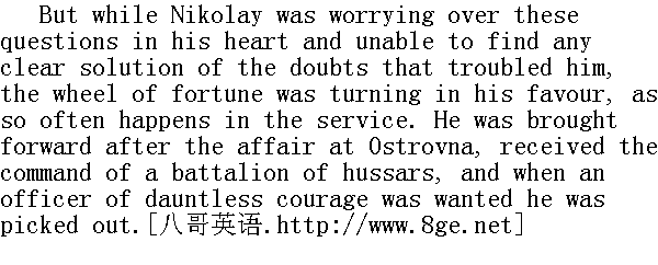 可是, 当尼古拉为这些问题操心, 怎么也不能给自己一个明确的答案, 是什么折磨着他时, 服役的幸运车轮又转到他身上。在奥斯特罗夫纳战役后, 他首先被提升了, 把一个营的骠骑兵交给他指挥。当需要勇敢军官的时候, 人们把委任给了他。