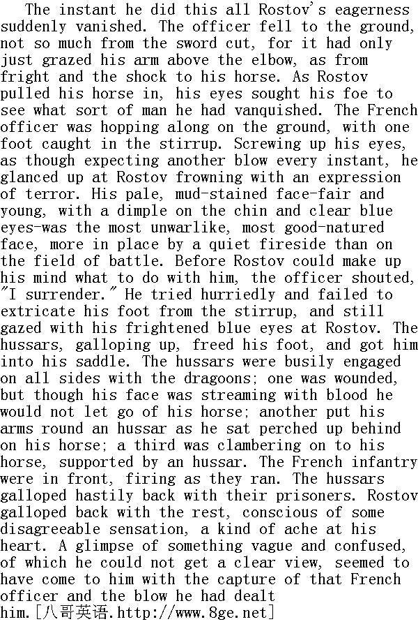 就在他这样做的同一刹那, 罗斯托夫全身劲头忽然消失了。那军官倒下了, 与其说他是由于刀劈, 不如说是由于马的冲撞和恐惧, 他的肘弯上方只受了一点轻伤。罗斯托夫勒住马, 以目光察看自己的敌人, 好看看他战胜了谁。那法军龙骑兵军官以一只脚在地上跳着, 另一只脚挂在马蹬上了。他吓得眯缝着眼睛, 好像等待随时可能的新的打击, 皱着眉头, 带着恐怖的表情从下往上望着罗斯托夫。他的脸色苍白, 沾满泥泞, 头发淡黄色, 年轻, 下巴上有个酒窝, 一双浅蓝色的眼睛, 完全不像战场上含有敌意的脸, 而是最平常和最普通的脸。在罗斯托夫还未决定拿他怎么办之前, 这军官就喊道: "Je me rends!"①他慌里慌张地想从马蹬里抽出脚来, 但是抽不出来, 一对惊慌的蓝眼睛, 不停地望着罗斯托夫。驰过来的骠骑兵帮他把脚抽出来并把他扶到马鞍上, 骠骑兵们从四方收容龙骑兵;有一个受了伤, 满脸是鲜血, 仍不愿放弃自己的马;另一个抱着骠骑兵坐在马屁股上;第三个由骠骑兵扶着才爬上马背。前方法军步兵一面奔跑, 一面射击。骠骑兵们赶忙带着自己的俘虏驰向后方, 罗斯托夫同别人一起驰向后方, 一种不愉快的感觉使他胸中发闷。他俘虏这个军官并劈他一刀所引起的某种模糊的、混乱的感觉, 他无论怎样也不能向自己解释。 ①法语: 我投降。 Count Osterman-Tolstoy met the hussars on their return, summoned Rostov, thanked him and told him he would report his gallant action to the Tsar and would recommend him for the cross of St. George. When Rostov was called up to Count Osterman, bethinking himself that he had received no command to charge, he had no doubt that his commanding officer sent for him to reprimand him for his breach of discipline. Osterman's flattering words and promise of a reward should, therefore, have been a pleasant surprise to Rostov; but he still suffered from that unpleasant vague feeling of moral nausea. "Why, what on earth is it that's worrying me?" he wondered, as he rode away from the general. "Ilyin? No, he's all right. Did I do anything disgraceful? No, that's not it either!" Something else fretted him like a remorse. "Yes, yes, that officer with the dimple. And I remember clearly how my hand paused when I had lifted it." 奥斯特曼·托尔斯泰伯爵迎着回来的骠骑兵, 他叫来罗斯托夫, 感谢他并说他将向皇帝报告他的英勇行为, 申请授予他圣乔治十字勋章。当人们叫罗斯托夫去见奥斯特曼伯爵时, 他记起自己不待命令就发起冲锋, 现在长官传唤他, 一定是为他的擅自行为而处罚他。所以奥斯特曼一番赞扬的话和许诺给他奖赏, 本应使罗斯托夫受宠若惊;但是仍然有一种不愉快的模糊的感觉使他恶心。"是什么使我痛苦不堪呢?"他问着自己离开了将军。"是伊林吗?不, 他安然无恙。是我做过什么丢脸的事吗?不, 没有那回事!"某件类似后悔的事折磨着他。"是的, 是的, 是为那个下巴有一个小酒窝的法国军官, 我清楚地记得, 我举起手臂又停住了。" Rostov saw the prisoners being led away, and galloped after them to look at his Frenchman with the dimple in his chin. He was sitting in his strange uniform on one of the spare horses, looking uneasily about him. The sword-cut in his arm could hardly be called a wound. He looked at Rostov with a constrained smile, and waved his hand by way of a greeting. Rostov still felt the same discomfort and vague remorse. 罗斯托夫看见被押走的俘虏, 于是驰到他们后面, 要看看自己那位下巴有酒窝的法国人。他穿着古怪的制服坐在骠骑兵的焦躁不安的马上, 神色不安地望着四周。他手臂上的伤几乎不算是伤。他向罗斯托夫装出笑脸、向他挥手致意。罗斯托夫就是这样也觉得不好意思, 有点害臊。 All that day and the next Rostov's friends and comrades noticed that, without being exactly depressed or irritable, he was silent, dreamy, and preoccupied. He did not care to drink, tried to be alone, and seemed absorbed in thought. Rostov was still pondering on his brilliant exploit, which, to his amazement, had won him the St. George's Cross and made his reputation indeed for fearless gallantry. There was something he could not fathom in it. "So they are even more frightened than we are," he thought. "Why, is this all that's meant by heroism? And did I do it for the sake of my country? And was he to blame with his dimple and his blue eyes? How frightened he was! He thought I was going to kill him. Why should I kill him? My hand trembled. And they have given me the St. George's Cross. I can't make it out, I can't make it out!" 当天和第二天, 罗斯托夫的朋友和同事们发现他闷闷不乐, 他不是寂寞, 不是生气, 而是默默不语, 若有所思, 神情专注。他毫无兴致地喝酒, 尽量一个人躲起来思索着什么。罗斯托夫老在想那使他惊奇的辉煌的战功, 赏给他圣乔治十字勋章, 甚至获得勇士的名声--他有一点弄不明白。"如此看来, 他们比我们还害怕!"他想。"这样就称为英雄气概吗?难道我这样做就是为祖国吗?那个生个小酒窝和蓝眼睛的人有什么罪呢?他多恐惧啊!他认为我会杀死他。为什么我要杀他呢?我的手发抖了。可他们授给我圣乔治十字勋章, 我一点也不明白!"