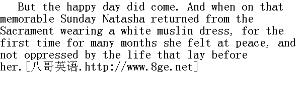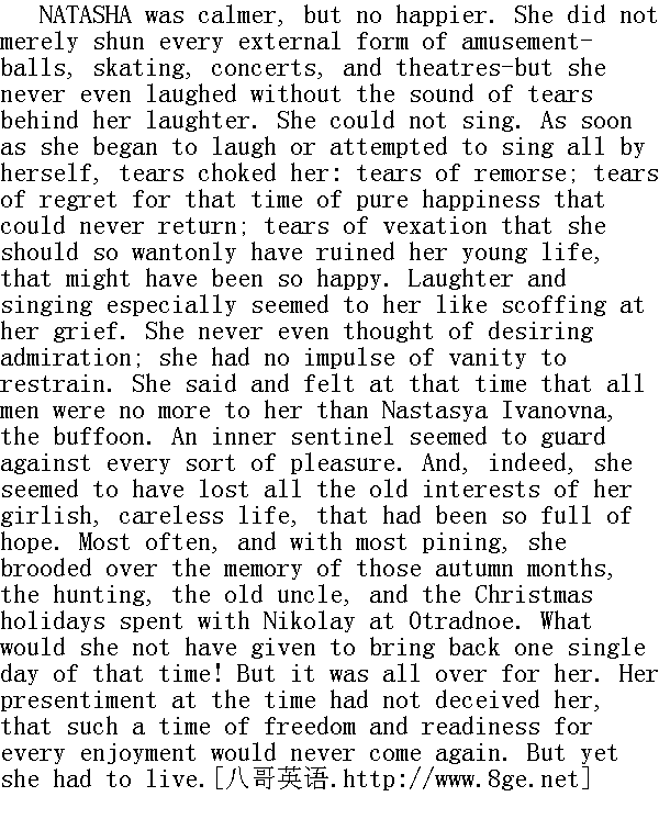 娜塔莎更平静了, 但是却不快活。她不仅回避外界所有使人愉快的环境: 舞会、滑冰、音乐会、剧院;而且没有哪一次笑星不含着泪水的。她不能唱歌。她刚一开始笑或者想独自一个人唱歌, 泪水便呜咽了她: 悔恨的眼泪, 对那一去不复返的纯洁时光回忆的泪;恼恨的泪, 恨自己白白地毁掉了那本来可以过得幸福的青春生活。她尤其觉得欢笑和歌唱对她的悲伤是一种亵渎。她不想搔首弄姿;她甚至不需要克制自己。她这样说, 也感觉到: 此时的男人对她来说完全与小丑娜斯塔西娅·伊万诺夫娜一样。内心的恐惧禁止她有任何欢乐。而且她已没有了往日所有的生活趣味, 那无忧无虑、充满希望的少女生活情趣。最经常也是最使她痛心的是回忆起往日的秋季, 狩猎, 叔叔和Nicolas一起在奥特拉德诺耶度过的圣诞节。哪怕再过上一天这样的时光, 她肯愿付出任何代价!但这一切都永远结束了。预感没有欺骗她, 无拘无束、随时都拥有所有快乐的生活已经一去不复返了。但是要活下去。 It comforted her to think, not that she was better, as she had once fancied, but worse, far worse than any one, than any one in the whole world. But that meant little to her. She believed it; but then she asked: "And what next?" And there was nothing to come. There was no gladness in life, but life was passing. All Natasha tried after was plainly to be no burden to others, and not to hinder other people's enjoyment; but for herself she wanted nothing. She held aloof from all the household. It was only with her brother, Petya, that she felt at ease. She liked being with him better than being with the rest, and sometimes even laughed when she was alone with him. She hardly left the house to go anywhere; and of the guests who came to the house she was only glad to see one person-Pierre. No one could have been more tender, circumspect, and at the same time serious, than Count Bezuhov in his manner to her. Natasha was unconsciously aware of this tenderness, and it was owing to it that she found more pleasure in his society. But she was not even grateful to him for it. Nothing good in him seemed to her due to an effort on Pierre's part. It seemed so natural to Pierre to be kind that there was no merit in his kindness. Sometimes Natasha noticed some confusion or awkwardness in Pierre in her presence, especially when he was trying to do something for her pleasure or afraid something in the conversation might suggest to her painful reminiscences. She observed this, and put it down to his general kindliness and shyness, which she supposed would be the same with every one else. Ever since those unforeseen words-that if he had been free, he would have asked on his knees for her hand and her love-uttered in a moment full of violent emotion for her, Pierre had said nothing of his feelings to Natasha; and it seemed to her clear that those words, which had so comforted her, had been uttered, just as one says any meaningless nonsense to console a weeping child. It was not because Pierre was a married man, but because Natasha felt between herself and him the force of that moral barrier-of the absence of which she had been so conscious with Kuragin-that the idea never occurred to her that her relations with Pierre might develop into love on her side, and still less on his, or even into that tender, self-conscious, romantic friendship between a man and a woman, of which she had known several instances. 使她愉快的是想到她不像她以前想的那么好, 而是比世界上任何人都更坏, 而且坏得多, 不过这还不够。她知道这一点, 并问自己: "以后怎么办呢?"而以后什么也没有。生活中没有任何欢乐, 而生活存流逝。虽然, 娜塔莎尽力不使任何人感到有负担, 只有不妨碍任何人, 可是自己什么也不需要。她避开所有家人, 只有与弟弟彼佳在一起才感到轻松些。比起与别人在一起, 她更愿和他在一起;有时他们的眼睛瞪着眼睛, 大笑起来。她几乎是不出户, 在常到她家里来的人中, 使她高兴的只有一个人--皮埃尔。没有人能比别祖霍夫伯爵待她更温存、更小心、更严肃的了。娜塔莎不知不觉中感觉得到这种温柔体贴, 因而与他在一起感到极大的欢愉。可是她并不感谢他的温存。她觉得皮埃尔做任何好事都不费力。好像皮埃尔是那样自然地善待所有的人, 他的善良并没有任何功劳。有时娜塔莎看出皮埃尔在她面前局促不安、不自然, 特别是当他害怕在谈话中可能有什么会引起娜塔莎难堪的回忆。她发现这点, 并认为这是由于他禀性善良和腼腆, 按照她的理解, 他对包括她在内的所有的人, 都一视同仁。自从他在她极度激动的时刻, 无意中说出如果他是自由的, 他会跪下来向她求爱的话之后, 皮埃尔再也未倾诉任何他对娜塔莎的感情;在她看来, 那些话显然是安慰她的话, 就像大人在安慰哭啼的孩子时随口说的话一样。不是由于皮埃尔是已婚的男人, 而是由于娜塔莎觉得在她与皮埃尔之间有很高的精神障碍, 她觉得与库拉金之间就没有那种障碍--她脑海中从未有过这类念头, 在她和皮埃尔的关系中, 不可能从她这方面, 更不可能从他那方面产生爱情, 甚至连那种她了解的几例男人和女人之间的温柔多情、羞羞答答、诗意般的友谊也不可能在她头脑中浮现。 Towards the end of St. Peter's fast, Agrafena Ivanovna Byelov, a country neighbour of the Rostovs, came to Moscow to pay her devotions to the saints there. She suggested to Natasha that she should prepare herself for the Sacrament, and Natasha caught eagerly at the suggestion. Although the doctors forbade her going out early in the morning, Natasha insisted on keeping the fast, and not