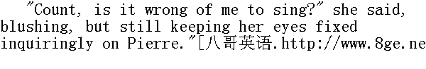 伯爵!怎么啦, 我唱得很糟吗?"她红着脸说, 却没有垂下眼睛, 而是疑问地望着皮埃尔。 "No.... Why should it be? On the contrary.... But why do you ask me?"" 哪里......为什么?恰恰相反......, 可是您为什么这样问我呢?" "I don't know myself," Natasha answered quickly; "but I shouldn't like to do anything you wouldn't like. I trust you in everything. You don't know how much you are to me, and what a great deal you have done for me!" ...She spoke quickly, and did not notice how Pierre flushed at these words. "I saw in that announcement, he, Bolkonsky" (she uttered the word in a rapid whisper), "he is in Russia, and in the army again. What do you think," she said hurriedly, evidently in haste to speak because she was afraid her strength would fail her, "will he ever forgive me? Will he not always have an evil feeling for me? What do you think? What do you think?"" 我自己也不知道"娜塔莎飞快地答道, "可我不愿做您不喜欢的任何事情。我完全相信您。您不知道, 您对我是多么重要, 您为我做了多少事情啊!......"她说得很快, 没有发现在她说这些话时皮埃尔脸红了。"在那同一个命令中, 我看见了他, 博尔孔斯基(她说这些话时, 说得很快, 声音又低)--他又在俄罗斯服役了。您认为怎样?"她又快又急地说, 显然害怕力不从心, "有一天他会原谅我吗?他不会对我抱有恶感吧?你以为怎样?您以为怎样?" "I think..." said Pierre. "He has nothing to forgive... If I were in his place..." From association of ideas, Pierre was instantly carried back in imagination to the time when he had comforted her by saying that if he were not himself, but the best man in the world and free, he would beg on his knees for her hand, and the same feeling of pity, tenderness, and love took possession of him, and the same words rose to his lips. But she did not give him time to utter them." 我想......"皮埃尔说, "他没什么要宽恕您的......如果是我处在他的地位......"由于回忆的关系, 皮埃尔的脑海中立刻重映出那一天的情景: 他安慰她说, 假如他不是他, 而是世界上最好而且自由的人, 他会跪下向她求婚, 于是同样是那种怜悯、温柔、爱恋的感情充满了他的心胸, 同样是那些话来到他的嘴边, 但是她不给他说出这些话的时间。 "Yes, you-you," she said, uttering that word you with enthusiasm, "that's a different matter. Any one kinder, more generous than you, I have never known-no one could be. If it had not been for you then, and now too... I don't know what would have become of me, because..." Tears suddenly came into her eyes: she turned away, held her music before her eyes, and began again singing and walking up and down the room." 您啊, 您, "她说, 带着欣喜说出这个您字, "您是另一回事。我不知道有谁能比您更善良、宽厚和更好的了, 不可能有这样的人。如果当时没有您, 甚至现在没有您, 我不知道, 我会怎么样, 因为......"泪水突然涌出她的眼眶;她转过身去, 拿起乐谱, 捧到眼前唱起来, 又在大厅里走来走去。