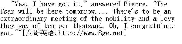 彼佳拉拉他的手, 好让他注意自己。 "Come, tell me about my plan, Pyotr Kirillitch, for mercy's sake! You're my only hope," said Petya." 我的事情怎么样, 彼得·基里雷奇, 看在上帝面上, 全靠您啦。"彼佳说。 "Oh yes, your plan. To be an hussar? I'll speak about it; to-day I'll tell them all about it."" 啊, 是的, 是的, 你的事。当骠骑兵?我去说, 我去说, 今天就去说。" "Well, my dear fellow, have you got the manifesto?" asked the old count. "My little countess was at the service in the Razumovskys' chapel; she heard the new prayer there. Very fine it was, she tells me."" 怎么样, mon cher①, 怎么样, 宣言搞到了吗?"老伯爵问。"伯爵夫人在拉祖莫夫斯基家做礼拜, 听到了新的祷文。祷文好极了, 她说。" ①法语: 亲爱的。