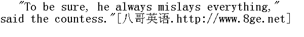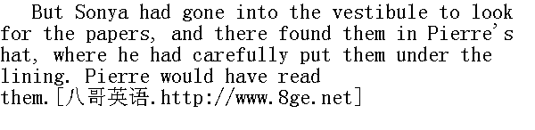 真的, 我不知道, 我把它放到哪儿去了。"他说。 Natasha came in with a softened and agitated face and sat down, looking mutely at Pierre. As soon as she came into the room, Pierre's face, which had been overcast, brightened, and while still seeking for the paper, he looked several times intently at her." 看你, 总是丢三落四的。"伯爵夫人说。娜塔莎脸上带着柔和而兴奋的神情走进来坐下, 默默地望着皮埃尔。她一走进屋里, 皮埃尔本来阴郁的面容, 顿时容光焕发, 他一边继续找着文件, 一面向她瞟了几眼。 "By God, I'll drive round, I must have forgotten them at home. Of course..."" 真的, 我要去一趟, 我忘在家里了。必须......" "Why, you will be late for dinner."" 那来不及吃饭了。" "Oh! and the coachman has not waited."" 啊, 车夫也离去了。"