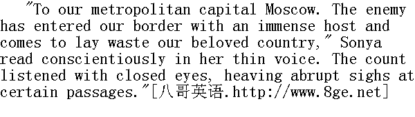 对古老的首都莫斯科的通告。""敌人的强大的兵力侵入俄罗斯境内。他要毁灭我们的亲爱的祖国, "索尼娅的尖细的声音卖力地读道。闭上眼睛的伯爵听到某些地方, 发出阵阵的叹息声。 Natasha sat erect, looking inquisitively and directly from her father to Pierre. 娜塔莎笔直地坐在那里, 用探究的目光时而望着父亲, 时而凝视着皮埃尔。 Pierre felt her eyes on him and tried not to look round. The countess shook her head disapprovingly and wrathfully at every solemn expression in the manifesto. In all these words she saw nothing but that the danger menacing her son would not soon be over. Shinshin, pursing his lips up into a sarcastic smile, was clearly preparing to make a joke at the first subject that presented itself: at Sonya's reading, the count's next remark, or even the manifesto itself, if no better pretext should be found. 皮埃尔感受到了那提问自己的目光, 但极力不回首去看。伯爵夫人不以为然地忿忿地摇摇头以反对宣言的每一个雄壮威严的句子。她在所有这些话中只看到了威胁她的儿子的危险还不会很快就终止。申申撇着嘴, 带着嘲讽的意味微笑着, 显然准备一有机会就这样做。嘲笑索尼娅的朗读, 嘲笑伯爵会说出的话。甚至嘲笑《告民众书》, 如果没有更好的借口的话。 After reading of the dangers threatening Russia, the hopes the Tsar rested upon Moscow, and particularly on its illustrious nobility, Sonya, with a quiver in her voice, due principally to the attention with which they were listening to her, read the last words: "We shall without delay be in the midst of our people in the capital, and in other parts of our empire, for deliberation, and for the guidance of all our militia levies both those which are already barring the progress of the foe, and those to be formed for conflict with him, wherever he may appear. And may the ruin with which he threatens us recoil on his own head, and may Europe, delivered from bondage, glorify the name of Russia!" 读到威胁俄罗斯的危险, 读到皇上对莫斯科寄予的希望, 特别是对名门贵族寄予的希望的时候, 索尼娅带着颤抖的声音, 这主要是由于大家聚精会神听她读, 她读到了最后几句话: "我们要刻不容缓地到首都的人民中去, 到全国各地去, 同我们的民团会商并指挥他们。他们正在阻击敌人的推进, 有的正组织起来打击敌人, 不管他们在哪儿出现, 就让敌人妄图加在我们身上的毁灭的命运, 落到他们自己的头上吧, 让从被奴役中解放出来的欧洲赞美俄罗斯的名声!" "That's right!" cried the count, opening his wet eyes, and several times interrupted by a sniff, as though he had put a bottle of strong smelling-salts to his nose. He went on, "Only let our sovereign say the word, we will sacrifice everything without grudging."" 好极了!"伯爵喊起来, 他睁开湿润的眼睛, 鼻子断断续续地呼哧了几下, 就像在他鼻子下面放了浓醋酸盐瓶似的。"只要皇上下令, 我们就不惜牺牲一切。"
