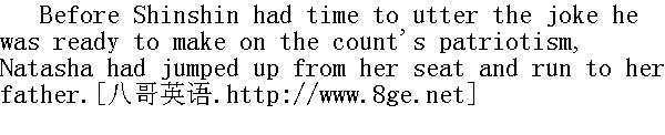 申申还没来得及说出已准备好的对伯爵爱国主义的嘲讽, 娜塔莎就从自己座位上跃起来, 向父亲跑过去了。 "What a darling this papa is!" she cried, kissing him, and she glanced again at Pierre with the unconscious coquetry that had come back with her fresh interest in life." 多可爱啊!这个爸爸!"她一边说, 一边亲吻他, 她又瞟了一眼皮埃尔, 带着她那又恢复了的不自觉的妩媚与活泼。 "Oh, what a patriot she is!" said Shinshin." 好一个女爱国者!"申申说。 "Not a patriot at all, but simply..." Natasha began, nettled. "You think everything funny, but this isn't at all a joke..."" 并不是什么爱国者, 不过是......"娜塔莎气愤地回答, "您觉得一切都好笑, 可这完全不是笑话......" "A joke," repeated the count. "Only let him say the word, we will all go... We're not a set of Germans!"" 谈不上玩笑!"伯爵重复道, "只要他下令, 我们都上, ......我们不是那些德国佬......"
