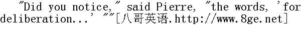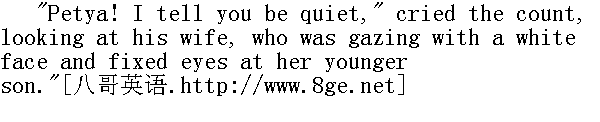 你们注意了没有, "皮埃尔说, "那上面说: '要会商'。" "Yes, to be sure, for whatever might come..."" 无论那儿做什么......" Meanwhile Petya, to whom no one was paying attention, went up to his father, and very red, said in a voice that passed abruptly from gruffness to shrillness, "Well, now, papa, I tell you positively-and mamma too, say what you will-I tell you you must let me go into the army, because I cannot... and that's all about it." 这时。谁也没有注意的彼佳走到父亲跟前, 满脸通红, 用时粗时细的变了音的嗓子说: "现在, 爸爸, 我要断然地说--对妈妈也是这样说--我决断地说, 请你们允许我参军, 因为我不能......这就是我要说的......" The countess in dismay turned her eyes up to heaven, clasped her hands, and said angrily to her husband: 伯爵夫人吃惊地两眼一翻, 两手一拍, 生气地对丈夫说。 "See, what your talk has brought us to!"" 这就说出事来了吧!"她说。