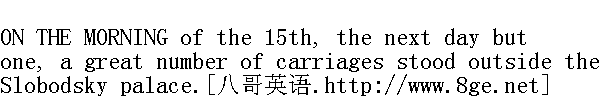 此后第三天, 即十五日早晨, 斯洛博达宫门前停着无数的马车。 The great halls were full. In the first were the noblemen in their uniforms; in the second there were merchants with medals and long beards, wearing blue, full-skirted coats. The first room was full of noise and movement. The more important personages were sitting on high-backed chairs at a big table under the Tsar's portrait; but the greater number of the noblemen were walking about the hall. 大厅里挤满了人。第一座里面, 是穿制服的贵族, 第二座里面, 是佩带奖章、留着大胡子, 穿着蓝灰色长衣的商人。在贵族会议大厅里, 发出嗡嗡的谈话声和走动声。在皇帝的挂像下的一张桌子旁, 一些最显贵的大官坐在高高的靠背椅里, 但大多数贵族都在大厅里走来走去。 The noblemen, whom Pierre saw every day either at the club or at their houses, were all in uniforms; some in those of Catherine's court, some in those of the Emperor Pavel, and some in the new uniforms of Alexander's reign, others in the common uniforms of the nobility, and the general character of their dress gave a strange and fantastic look to these old and young, most diverse and familiar faces. Particularly striking were the older men, dim-eyed, toothless, bald, and thin, with faces wrinkled or lost in yellow fat. They sat still for the most part and were silent, or if they walked and talked, attached themselves to some one younger. Just like the faces Petya had seen in the crowd, all these faces, in their universal expectation of something solemn, presented a striking contrast with their everyday, yesterday's aspect, when talking over their game of boston, Petrushka the cook, the health of Zinaida Dmitryevna, etc., etc. 所有这些贵族, 都是皮埃尔每天不是在俱乐部就是在他们家里见过的, 现在他们一律身着制服, 有的穿叶卡捷琳娜女皇时代的, 有的穿保罗皇帝时代的, 有的穿亚历山大皇帝新朝的制服, 还有的穿一般的贵族制服, 这种制服的共同特征, 就是给这些老老少少、各式各样、平时面熟的人物增添一种稀奇古怪的意味。特别令人注目的是那些老头子, 他们两眼昏花、牙齿脱落、脑壳光秃, 面孔浮肿, 皮肤姜黄, 或者满脸皱纹, 瘦骨嶙峋。他们多半坐在座位上一声不响。如果他们走动一下, 找人说说话, 那也是专找某个年轻人。所有这些人也像彼佳在广场上见到的那些人的面孔一样, 对立者面容令人吃惊: 对某种重大庄严事情的期待和对日常的、昨天的事情的看法, 如对波士顿牌局、彼得鲁什卡厨师、季娜伊达·德米特里耶夫娜的健康及其他诸如此类的事情的看法。 Pierre, who had been since early morning in an uncomfortable uniform, that had become too tight for him, was in the room. He was in a state of excitement; this extraordinary assembly, not only of the nobility, but of the merchant class too-the estates, etats generaux-called up in him a whole series of ideas of the Contrat Social and the French Revolution, ideas imprinted deeply on his soul, though they had long been laid aside. The words he had noticed in the manifesto, that the Tsar was coming to the capital for deliberation with his people, confirmed him in this chain of thought. And supposing that something of importance in that direction was near at hand, that what he had long been looking for was coming, he looked and listened attentively, but he saw nowhere any expression of the ideas that engrossed him. 一大早, 皮埃尔身着一件窄瘦的贵族制服(这制服使他行动笨拙)来到大厅。他心情很激动: 这次不平常的集会(不仅有贵族, 而且也有商人参加--包括Les etats generaux①各阶层), 引起他一连串久已搁置的、但深深印在心中的关于Contrat So-cial②和法国大革命的联想。他在《告民众书》中看到一句话, 说皇上返回首都是为了同民众共商国事, 这更肯定了他的想法。固此他认为, 他久已期待的重要事件就要来了, 于是他走来走去, 观察, 倾听, 但是到处都没有发现他所关心的那种思想。 ①法语: 三级会议。 The Tsar's manifesto was read, and evoked enthusiasm; and then all moved about, talking. Apart from their everyday interests, Pierre heard discussion as to where the marshals were to stand when the Tsar should come in, when the ball was to be given for the Tsar, whether they were to be divided according to districts or the whole province together... and so on. But as soon as the war and the whole object of their meeting together was touched upon, the talk was uncertain and hesitating. Every one seemed to prefer listening to speaking. 宣读皇帝的宣言时, 引起一阵狂喜, 然后大家谈论着散开了。皮埃尔除了听到一些日常的话题, 还听到人们谈论: 皇上进来时, 首席贵族应当站在什么地方, 什么时候举行招待皇帝的舞会, 各县分开还是全省在一起......等等;但一涉及战争和如何召来贵族, 就谈得不那么明确, 含糊其辞了。大家都愿意听而不愿意说了。 A manly-looking, handsome, middle-aged man, wearing the uniform of a retired naval officer, was speaking, and a little crowd was gathered about him in one of the rooms. Pierre went up to the circle that had formed round him, and began to listen. Count Ilya Andreitch, in his uniform of Catherine's time, was walking about with a pleasant smile among the crowd, with all of whom he was acquainted. He too approached this group, and began to listen with a good-humoured smile, as he always did listen, nodding his head approvingly in token of his agreeing with the speaker. The retired naval officer was speaking very boldly (that could be seen from the expression on the faces of the listeners and from the fact that some persons, known to Pierre as particularly submissive and timid, drew back from him