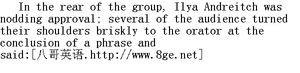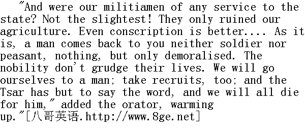 试问, 难道我们的义勇军对国家有利吗?毫无利益可言!只能糟蹋我们的财产。最好是再征兵......不然, 复员回来的, 兵不像兵, 庄稼人不像庄稼人, 只落个浪荡胚子。贵族不吝惜自己的性命, 我们人人都去参军, 人人都去招兵, 只要圣上(他这样称呼皇帝)一声号召, 我们全都去为他牺牲。"这位演说家又激昂慷慨地补充说。 Ilya Andreitch's mouth was watering with satisfaction, and he nudged Pierre, but Pierre wanted to speak too. He moved forward, feeling stirred, though he did not yet know why nor what he would say. He was just opening his mouth to speak when he was interrupted by a perfectly toothless senator with a shrewd and wrathful face, who was standing close by the last orator. Evidently accustomed to lead debates and bring forward motions, he began speaking in a low but audible voice: 伊利亚·安德烈伊奇欢喜得直咽口水, 不住地捅捅皮埃尔, 但皮埃尔也急于要说话, 他挤向前去, 他觉得自己非常兴奋, 但是他自己也不知道兴奋什么, 不知道要说什么。他刚要开口, 一个离那个讲话的人很近的枢密官--此人牙齿掉得精光, 有一张聪明的面孔, 但满脸怒容, 他打断了皮埃尔的话。他显然惯于主持讨论和处理问题。他的声音很低, 但还听得见。 "I imagine, my dear sir," said the senator, mumbling with his toothless mouth, "that we are summoned here not to discuss which is more suitable for the country at the present moment-conscription or the militia. We are summoned to reply to the appeal which our sovereign the Emperor graciously deigns to make to us. And to judge which is the fitter means-recruiting or a levy for militia-we leave to a higher power...."" 我认为, 阁下, "枢密官用没有牙齿的嘴巴含糊不清地说, "我们被召来不是讨论目前对国家更有利的是什么--是征兵还是成立义勇军。我们是来响应皇帝陛下对我们的号召的。至于说征兵有利还是成立义勇军有利, 我们恭候最高当局的裁决......" Pierre suddenly found the right outlet for his excitement. He felt exasperated with the senator, who introduced this conventional and narrow view of the duties that lay before the nobility. Pierre stepped forward and cut him short. He did not know himself what he was going to say, but he began eagerly, using bookish Russian, and occasionally relapsing into French. 皮埃尔的满腔豪情突然有了发泄的机会。那位枢密官对目前贵族当务之急提出迂腐而狭隘的观点, 皮埃尔对此予以无情的驳斥。皮埃尔走向前去制止住他。连他自己也不知要说什么, 就开始热烈地说起来, 时而夹杂一些法语时而用书面俄语表达。 "Excuse me, your excellency," he began (Pierre was well acquainted with this senator, but he felt it necessary on this occasion to address him formally), "though I differ from the gentleman..." (Pierre hesitated; he would have liked to say Mon tres honorable preopinante) "with the gentleman...whom I have not the honour of knowing; but I imagine the estate of the nobility, apart from the expression of its sympathy and enthusiasm, has been convoked also to deliberate upon the measures by which we can assist our country. I imagine," said Pierre, growing warmer, "that the Tsar would himself be displeased if he should find in us only the owners of peasants, whom we give up to him, and chair a canon, which we offer in ourselves-and should not find in us co...co ...counsel...."" 请原谅, 阁下, "他开始说(皮埃尔同这位枢密官是老相识, 但是他认为这时对他有打官腔的必要), "虽然我不赞同这位先生......(皮埃尔讷讷起来, 他本来想说mon tres honorable preopinant①)也不赞同这位先生......que je n'ai pas l'honneur de connalAtre②;但是我认为, 贵族被请来, 除了表一表他们的同情和喜悦, 还应当商讨拯救我们祖国的大计。我认为, "他激昂地说, "如果皇上看见我们只不过是一些把自己的农奴献给他的农奴主, 只不过是我们把自己充......充当chair a conon③, 而从我们这儿没有得到救......救......救亡的策略, 那么, 皇上是不会满意的。" ②法语: 我还没有荣幸认识他。 ③法语: 炮灰。 Many persons moved a little away from the circle, noticing the disdainful smile of the senator and the freedom of Pierre's words. Ilya Andreitch was the only person pleased at what Pierre said, just as he had been pleased with the naval officer's speech and the senator's, as he always was with the last speech he had heard. 许多人看到枢密官露出轻蔑的微笑和皮埃尔信口雌黄, 就从人群中走开了;只有伊利亚·安德烈伊奇对皮埃尔的话很满意, 正像他对海军军人的话, 枢密官的话, 总之, 对他刚听到的任何人的话, 全都满意一样。 "I consider that before discussing these questions," Pierre continued, "we ought to ask the Emperor, most respectfully to ask his majesty, to communicate to us what forces we have, what is the position of our men and our army, and then..."" 我认为, 在讨论这种问题之前, "皮埃尔接着说, 我们应当问问皇上, 恭恭敬敬地请陛下告诉我们, 我们有多少军队, 我们的军队和正在作战的部队情况如何, 然后......"