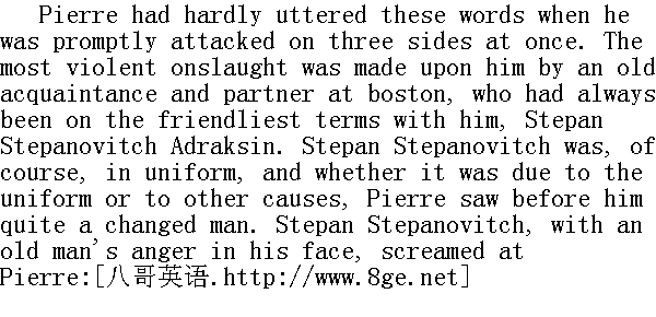 但是, 皮埃尔还没有把话说完, 就忽然受到了三方面的攻击。攻击他最利害的是一个他的老相识斯捷潘·斯捷潘诺维奇·阿普拉克辛, 此人是玩波士顿牌的能手, 对皮埃尔一向怀有好感。斯捷潘·斯捷潘诺维奇身穿制服, 不知是由于这身制服还是由于别的原因, 此时, 皮埃尔看见的是一个完全异样的人。斯捷潘·斯捷潘诺维奇脸上突然露出老年人的凶相, 向皮埃尔呵斥道: " "In the first place, let me tell you that we have no right to ask such questions of the Emperor; and secondly, if the nobility had any such right, the Emperor could not answer such questions. The movements of the troops depend on the movements of the enemy; the troops are augmented and decreased..." 首先, 启禀阁下, 我们无权向皇上询问此事;其次, 俄国贵族就算有此种权利, 皇上也可能答复我们。军队是要看敌人的行动而行动的--军队的增和减......" Another voice interrupted Adraksin. The speaker was a man of forty, of medium height, whom Pierre had seen in former days at the gypsies' entertainments, and knew as a bad card-player. But now he, too, was quite transformed by his uniform, as he moved up to Pierre. 另外一个人的声音打断了阿普拉克辛的话, 这个人中等身材, 四十来岁, 前些时候皮埃尔在茨冈舞女那儿常常看见他, 知道他是一个蹩脚的牌手, 他今天也因穿了制服而变了样子, 他向皮埃尔迈进一步。 "Yes, and it's not the time for deliberation," said this nobleman."What's needed is action; there is war in Russia. Our foe comes to ruin Russia, to desecrate the tombs of our fathers, to carry away our wives and children." The gentleman struck himself a blow on the chest. "We will all rise up; we will all go to a man, we will follow our father the Tsar!" he cried, rolling his bloodshot eyes. Several approving voices could be heard in the crowd. "We are Russians and we do not grudge our blood for the defence of our faith, our throne, and our country. But we must put a stop to idle talk, if we are true sons of our fatherland. We will show Europe how Russia can defend Russia!" shouted this gentleman."" 而且现在不是发议论的时候, "这是那个贵族的声音, "而是要行动。战火已经蔓延到俄国。敌人打来了, 它要灭掉俄国, 践踏我们祖先的坟墓, 掠走我们的妻子儿女。"这个贵族捶着胸脯。"我们人人都要行动起来, 勇往直前, 为沙皇圣主而战!"他瞪着充血的眼睛, 喊道。人群中有些赞许的声音。为了捍卫我们的信仰, 王位和祖国, 我们俄罗斯人不惜流血牺牲。如果我们是祖国的男儿, 就不要净说漂亮话吧。我们要让欧洲知道, 俄国人是怎样站起来保卫祖国的。"那个贵族喊道。 Pierre tried to reply, but he could not get in a word. He felt that the sound of his words, apart from any meaning they conveyed, was less audible than the sound of his excited adversary's voice. 皮埃尔想反对, 但是一句话也说不出。他觉得, 问题不在他的话包含什么思想, 而是他的声音总不如生气勃勃的贵族说得响亮。