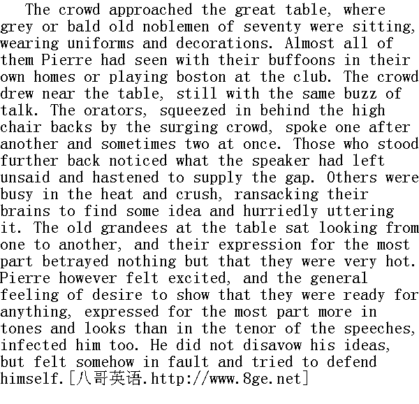 人群向一张大桌子走去, 桌旁坐着几位身着制服, 佩带绶带, 白发秃顶的七十来岁的达官显贵, 差不多全是皮埃尔常见的, 看见他们在家里逗小丑们取乐, 或者在俱乐部里打波士顿牌。人群吵吵嚷嚷地向桌旁走去。讲话的人一个接着一个, 有时两个一齐讲, 说话的人被熙熙攘攘的人群挤到高椅背后面。站在后面的人发现讲话的人有什么没讲到的地方, 就赶紧加以补充。别的人则在这热气腾腾和拥挤的气氛中, 绞尽脑汁, 想找点什么, 好赶快说出来。皮埃尔认识的那几个年高的大官坐在那儿, 时而看看这个, 时而看看那个, 他们脸上的表情很明显, 只说明他们觉得很热。然而皮埃尔的情绪也高昂起来, 那种普遍表示牺牲一切在所不惜的气概(多半表现在声音上, 而不是表现在讲话的内容上)也感染了他。他不放弃自己的意见, 但是他觉得他犯了什么错误, 想辩解一下。 "I only said that we could make sacrifices to better purpose when we know what is needed," he cried, trying to shout down the other voices." 我只是说, 当我们知道迫切需要是什么的时候, 我们的牺牲就会更有价值。"他竭力压倒别人的声音, 赶忙说。 One old man close by him looked round, but his attention was immediately called off by a shout at the other end of the table. 一个离得最近的小老头回头看了他一眼, 随即被桌子另一边的声音吸引过去。 "Yes, Moscow will be surrendered! She will be the expiation!" one man was shouting." 是的, 就要放弃莫斯科了!它将要成为赎罪品牺牲品!"有人喊道。