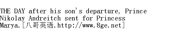 儿子离家的第二天, 尼古拉·安德烈伊奇公爵把玛丽亚公爵小姐叫到他自己跟前。 "Well, now are you satisfied?" he said to her. "You have made me quarrel with my son! Are you satisfied? That was all you wanted! Satisfied? ... It's a grief to me, a grief. I'm old and weak, and it was your wish. Well, now, rejoice over it. ..." And after that, Princess Marya did not see her father again for a week. He was ill and did not leave his study." 怎么样, 你现在满意了吧?"他对她说, "你使我同儿子吵了一架!满意了吧?你就需要这样!满意了吧?......真叫我痛心又痛心啊!我老了, 不行了, 这也是你所希望的。那么你就高兴了吧, 得意了吧......"此后, 玛丽亚公爵小姐有一个星期没有见到父亲。因为他生病了, 没有离开过他的书房。 Princess Marya noticed to her surprise that during this illness the old prince excluded Mademoiselle Bourienne too from his room. Tihon was the only person who looked after him. 玛丽亚公爵小姐感到惊奇的是, 她注意到, 老公爵在生病期间也不让布里安小姐到他跟前去。只有吉洪一个人侍候他。 A week later the prince reappeared, and began to lead the same life as before, showing marked energy in the laying out of farm buildings and gardens, and completely breaking off all relations with Mademoiselle Bourienne. His frigid tone and air with Princess Marya seemed to say: "You see, you plotted against me, told lies to Prince Andrey of my relations with that Frenchwoman, and made me quarrel with him, but you see I can do without you, and without the Frenchwoman too." 过了一周, 公爵出来了, 又开始了以前的生活。他特别积极地从事建筑和园艺方面的活动, 而且断绝了他和布里安小姐过去的一切关系。他的神态和对玛丽亚公爵小姐冷淡的口气, 好像是对她说: "你要知道, 你对我胡乱猜想, 向安德烈公爵胡说我和法国女人的关系, 使得我同他吵架, 而你知道了吧, 我既不需要你, 也不需要法国女人。" One half of the day Princess Marya spent with Nikolushka, giving him his Russian lessons, following his other lessons, and talking to Dessalle. The rest of the day she spent in reading, or with her old nurse and "God's folk," who came by the back stairs sometimes to visit her. The war Princess Marya looked on as women do look on war. She was apprehensive for her brother who was at the front, and was horrified, without understanding it, at the cruelty of men, that led them to kill one another. But she had no notion of the significance of this war, which seemed to her exactly like all the preceding wars. She had no notion of the meaning of this war, although Dessalle, who was her constant companion, was passionately interested in the course of the war, and tried to explain his views on the subject to her, and although "God's folk" all, with terror, told her in their own way of the rumours among the peasantry of the coming of Antichrist, and although Julie, now Princess Drubetskoy, who had renewed her correspondence with her, was continually writing her patriotic letters from Moscow. 玛丽亚公爵小姐每天一半时间和尼古卢什卡度过, 照管他做功课, 亲自教他俄语和音乐, 并同德萨尔进行交谈, 另外半天时间, 她则看书, 同老保姆在一起, 有时又同从后门进来看她的神亲们一起消磨时间。玛丽亚公爵小姐对战争的看法和一般妇女对战争的看法一样。她为参战的哥哥而担心, 她为迫使人们互相屠杀的人世间的残忍既感到恐怖, 却又不理解这次战争的意义, 认为这跟过去的一切战争都是一样的。尽管非常关心战况的德萨尔经常和她交谈, 极力向她说明他自己的想法, 尽管前来看她的神亲们总是按照他们自己的看法, 胆战心寒地讲述了有关基督的敌人入侵的民间传闻, 尽管现在是德鲁别茨卡娅公爵夫人--朱莉又恢复了与她的信函往来, 从莫斯科给她写来了许多爱国的信件, 但是她仍然不理解这次战争的意义。