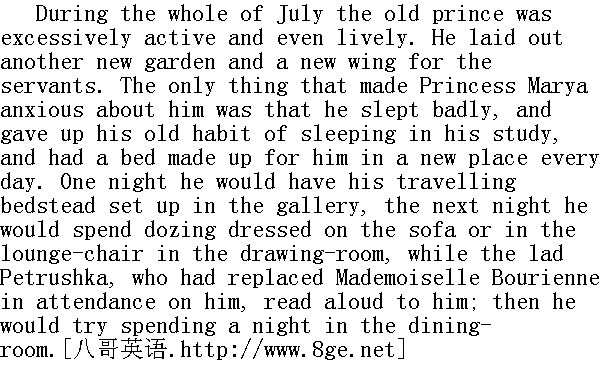 整个七月, 老公爵都非常积极, 甚至生气勃勃。他奠定了又一座新的花园和为仆人建造一座新的楼房的基础。唯一使玛丽亚公爵小姐感到不安的是, 他睡眠很少了, 并改变了他在书房里的习惯, 而且每天都要更动自己过夜的地方。有时, 他命令人在走廊里打开他的行军床;有时, 他不脱衣服躺在客厅里的沙发上或者坐在伏尔泰椅上;有时, 他不让布里安小姐, 而是叫家童彼得鲁沙给他朗读;有时, 他也就在食堂里过夜。 On the first of August a second letter came from Prince Andrey. In his first letter, which had been received shortly after he left home, Prince Andrey had humbly asked his father's forgiveness for what he had permitted himself to say to him, and had begged to be restored to his favour. To this letter, the old prince had sent an affectionate answer, and from that time he had kept the Frenchwoman at a distance. Prince Andrey's second letter was written under Vitebsk, after the French had taken it. It consisted of a brief account of the whole campaign, with a plan sketched to illustrate it, and of reflections on the probable course it would take in the future. In this letter Prince Andrey pointed out to his father the inconvenience of his position close to the theatre of war, and in the direct line of the enemy's advance, and advised him to move to Moscow. 八月一日, 收到安德烈公爵的第二封信。在他走后不久收到的第一封信里, 安德烈公爵恭顺地请求父亲对他所说的话加以宽恕, 并请求父亲恢复对他的宠爱。老公爵给他亲切地回了一封信, 之后他就与法国女人疏远了。安德烈公爵的第二封信是在法军占领了维捷布斯克附近写的, 信中简要地描写了战役的整个过程和战役示意图, 以及对今后战局的看法。同时安德烈公爵在这封中还对他父亲说, 他住的地方接近战场, 正处在军事交通线路上, 是很不利的, 并且劝他父亲到莫斯科去。 At dinner that day, on Dessalle's observing that he had heard that the French had already entered Vitebsk, the old prince recollected Prince Andrey's letter. 在这天吃饭的时候, 德萨尔说, 他听到说法军已经入侵维捷布斯克, 老公爵顿时想起了安德烈公爵的来信。 "I have heard from Prince Andrey to-day," he said to Princess Marya; "have you read the letter?"" 今天收到了安德烈公爵的来信, "他对玛丽亚公爵小姐说, "你看过了吧?" "No, mon pere," the Princess answered timidly. She could not possibly have read the letter, of which indeed she had not heard till that instant." 没有过, mon pere.①。"公爵小姐吃惊地回答说。她未曾看过信, 甚至关于收到信的事也没有听到过。 "He writes about this war," said the prince, with the contemptuous smile that had become habitual with him in speaking of the present war." 他在信里又谈到这次战争, "公爵带着那已成为他习已为常, 一提起目前的战争就露出轻蔑的微笑说。 "It must be very interesting," said Dessalle. "Prince Andrey is in a position to know. ..."" 想必是很有趣的!"德萨尔说。"公爵会知道的......" "Ah, very interesting!" said Mademoiselle Bourienne." 啊, 是非常有趣的?"布里安小姐说。 "Go and get it for me," said the old prince to Mademoiselle Bourienne. "You know, on the little table under the paper-weight."" 您去给我把信拿来!"老公爵对布里安小姐说。"您是知道的, 信就在小桌子上的压板下面。"