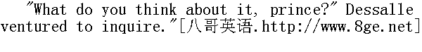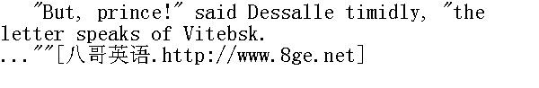 但, 公爵, "德萨尔胆怯地说, "信里提到的是维捷布斯克......" "Ah, the letter? Yes, ..." said the prince, with displeasure. "Yes ... yes ..." His face suddenly assumed a gloomy expression. He paused. "Yes, he writes, the French have been beaten. On what river was it?"" 啊, 信里提到了吗?是的......"公爵不满意地说, "是的......是的......"他的面容突然显出来阴沉的表情。他沉默了一会儿。"是的, 他在信中写道, 法军在哪条河上被击溃的呀?" Dessalle dropped his eyes. "The prince says nothing about that," he said gently. 德萨尔垂下眼睛。"公爵在信里并没有提到这件事。"他低声说。 "What, doesn't he? Why, you don't suppose I imagined it."" 真的没有提到吗?哼, 我才不会瞎编的。" Every one was for a long time silent. 大家长时间地沉默不语。