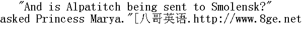 要派阿尔帕特奇到斯摩棱斯克去吗?"玛丽亚公爵小姐问。 "To be sure; he's been waiting a long while for his orders."" 可不是, 他已经等了好久。"