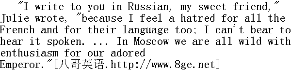 我的好朋友!我现在用俄文给您写信, "--朱莉写道--"因为我恨所有的法国人, 同样地恨他们的语言, 我也听不得人家讲那种语言......, 由于对我们所崇拜的皇帝的热情, 我们在莫斯科都感到非常振奋。" "My poor husband is enduring hardships and hunger in wretched Jewish taverns, but the news I get from him only increases my ardour." 我那可怜的丈夫现在住在犹太人的旅店里受苦挨饿, 但是我所得到的种种信息更加使我鼓舞。" "You have doubtless heard of the heroic action of Raevsky, who embraced his two sons and said, 'We will die together, but we will not flinch!' And though the enemy were twice as strong, we did not in fact flinch. We kill time here as best we can; but in war, as in war. Princess Alina and Sophie spend whole days with me, and we, unhappy windows of living husbands, have delightful talks over scraping lint. We only want you, my darling, to make us complete," etc., etc. 想必您听到了拉耶夫斯基的英雄事迹了, 他曾抱着两个儿子说: 我要和他们同归于尽, 但我们决不动摇!的确, 敌人的力量虽然比我们强一倍, 可是我们却岿然不动。我们尽可能地消磨时间。但战时就像战时嘛?阿琳娜公爵小姐和索菲同我整天坐在一起, 我们是不幸的守活寡的妇人, 在作棉线团时①大家聊得兴致勃勃;只少您在这儿, 我的朋友......"等等。 ①旧时把破棉布撕下来代替药棉裹伤用的。 The principal reason why Princess Marya failed to grasp the significance of the war was that the old prince never spoke of it, refused to recognize its existence, and laughed at Dessalle when he mentioned the war at dinner-time. The prince's tone was so calm and confident that Princess Marya put implicit faith in him." 玛丽亚公爵小姐之所以不理解这次战争的全部意义, 主要是因为老公爵从来不谈战争, 也不承认有战争, 而且在吃饭时嘲笑谈论这次战争的德萨尔。老公爵的口气是如此之平静而又自信, 以致玛丽亚公爵小姐毫无异议地相信他的话。